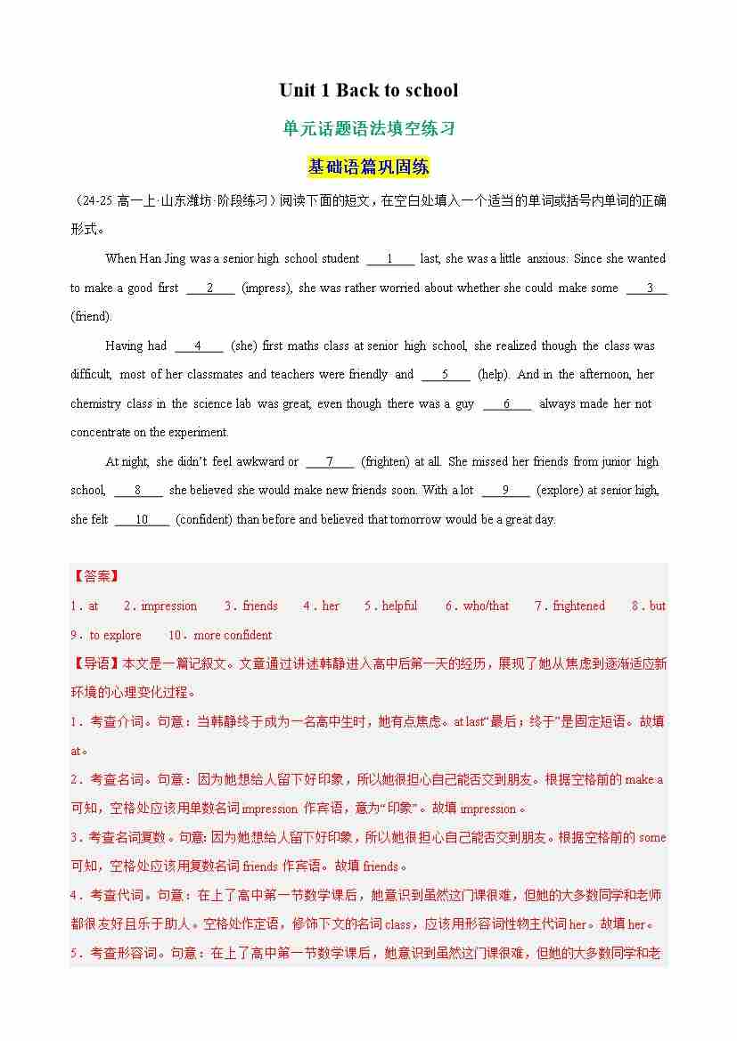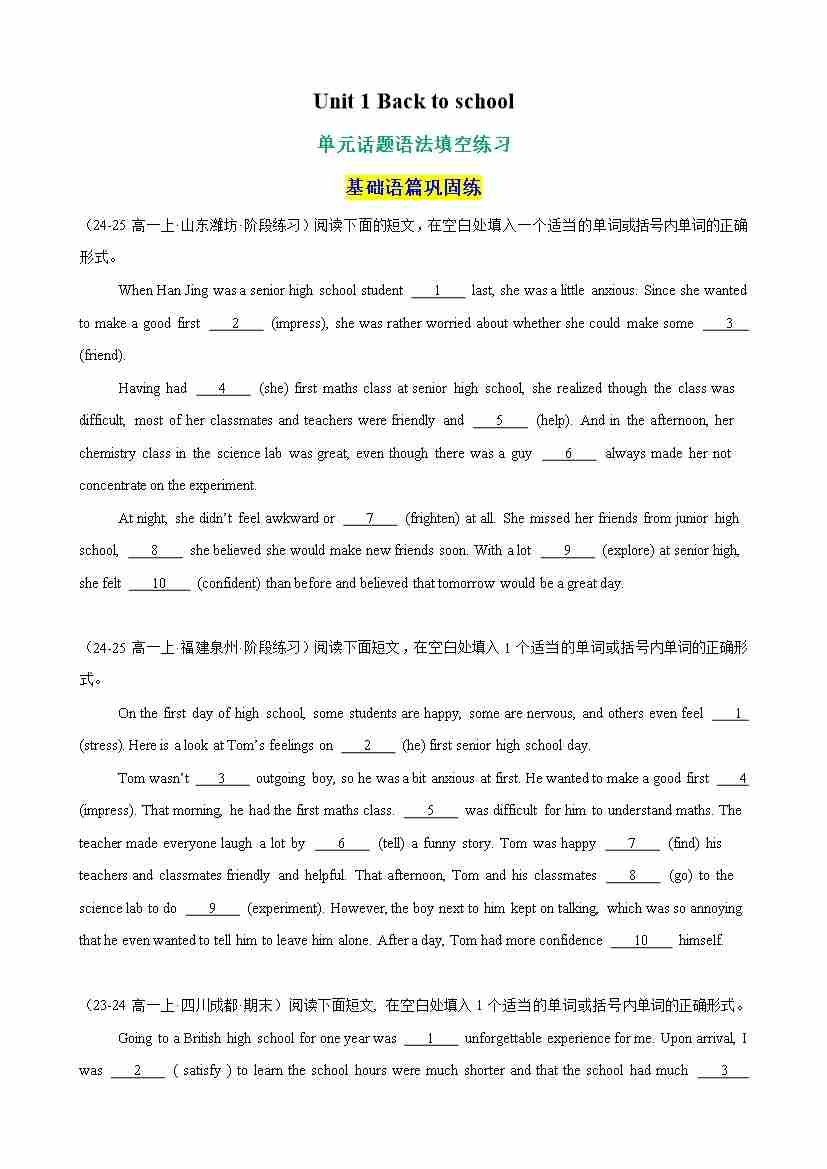 Unit 1 Back to school 单元话题语法填空练习(学生版)