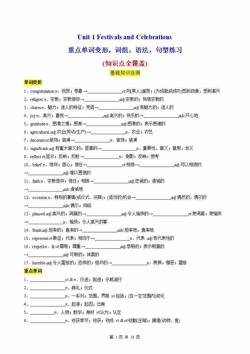 Unit 1 Festivals and Celebrations 重点单词,短语,句型,语法专项训练(分层作业)(解析版)