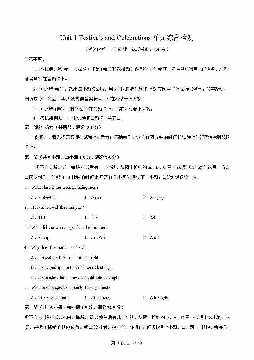 Unit 1 Festivals and Celebrations(单元测试)(解析版)