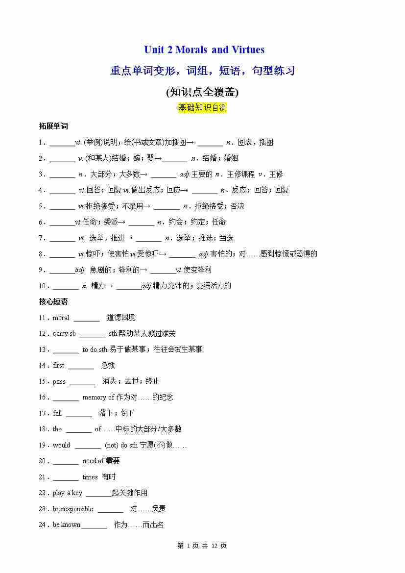 Unit 2 Morals and Virtues 重点单词,短语,句型,语法练习(分层作业)(原卷版)
