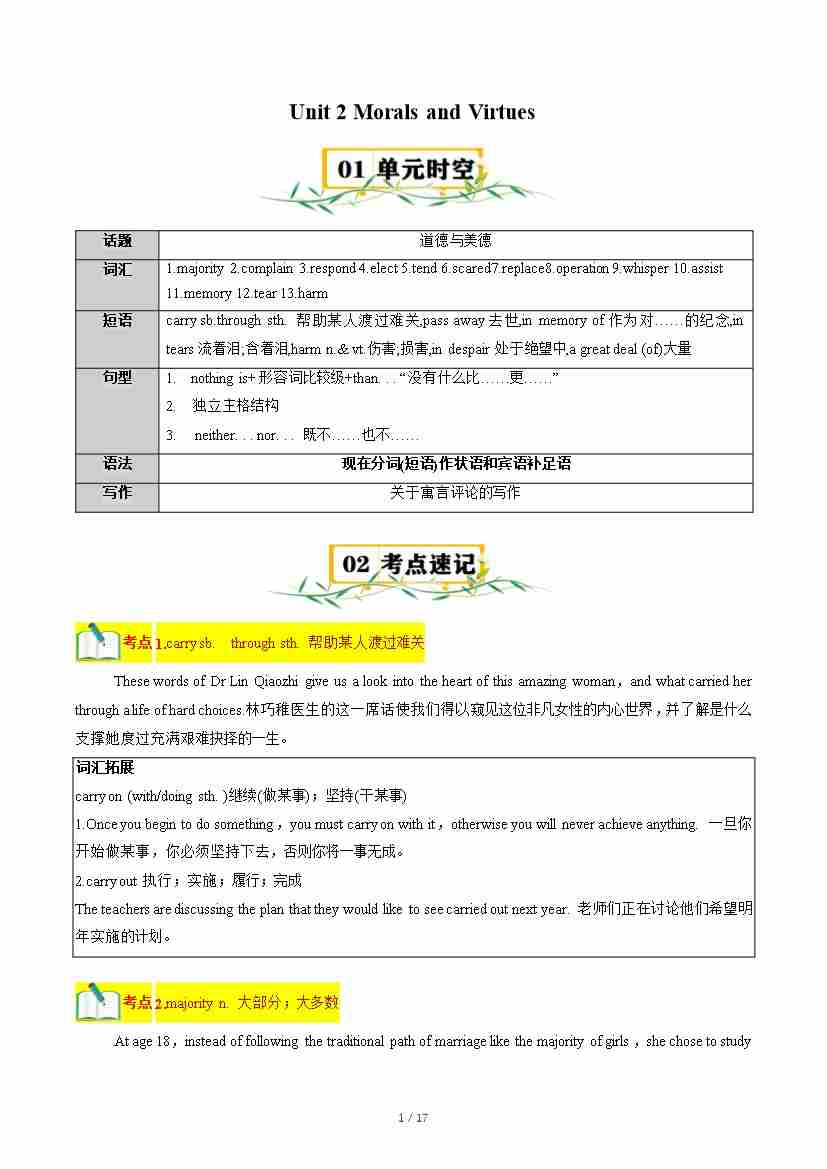 Unit 2 Morals and Virtues【速记清单】(原卷版)
