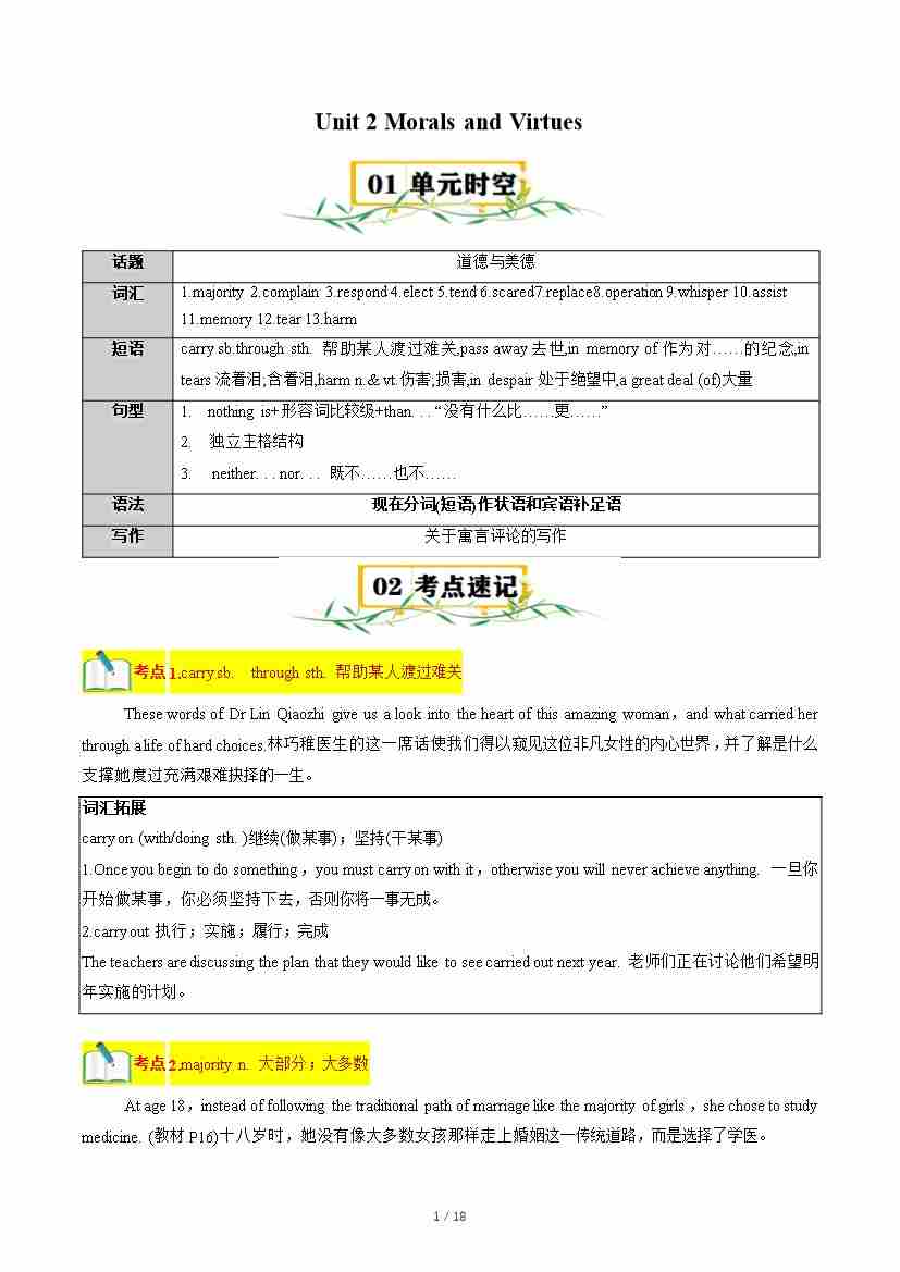 Unit 2 Morals and Virtues【速记清单】(解析版)