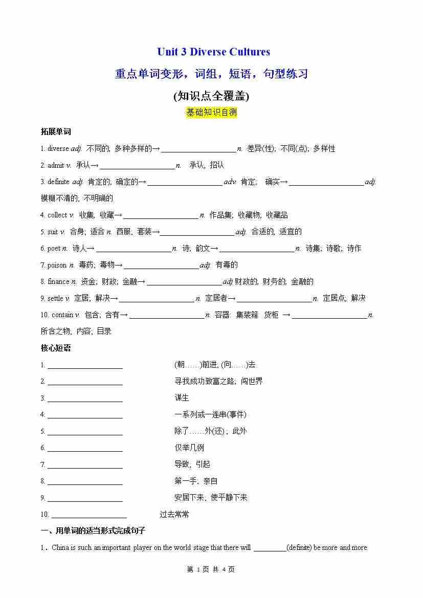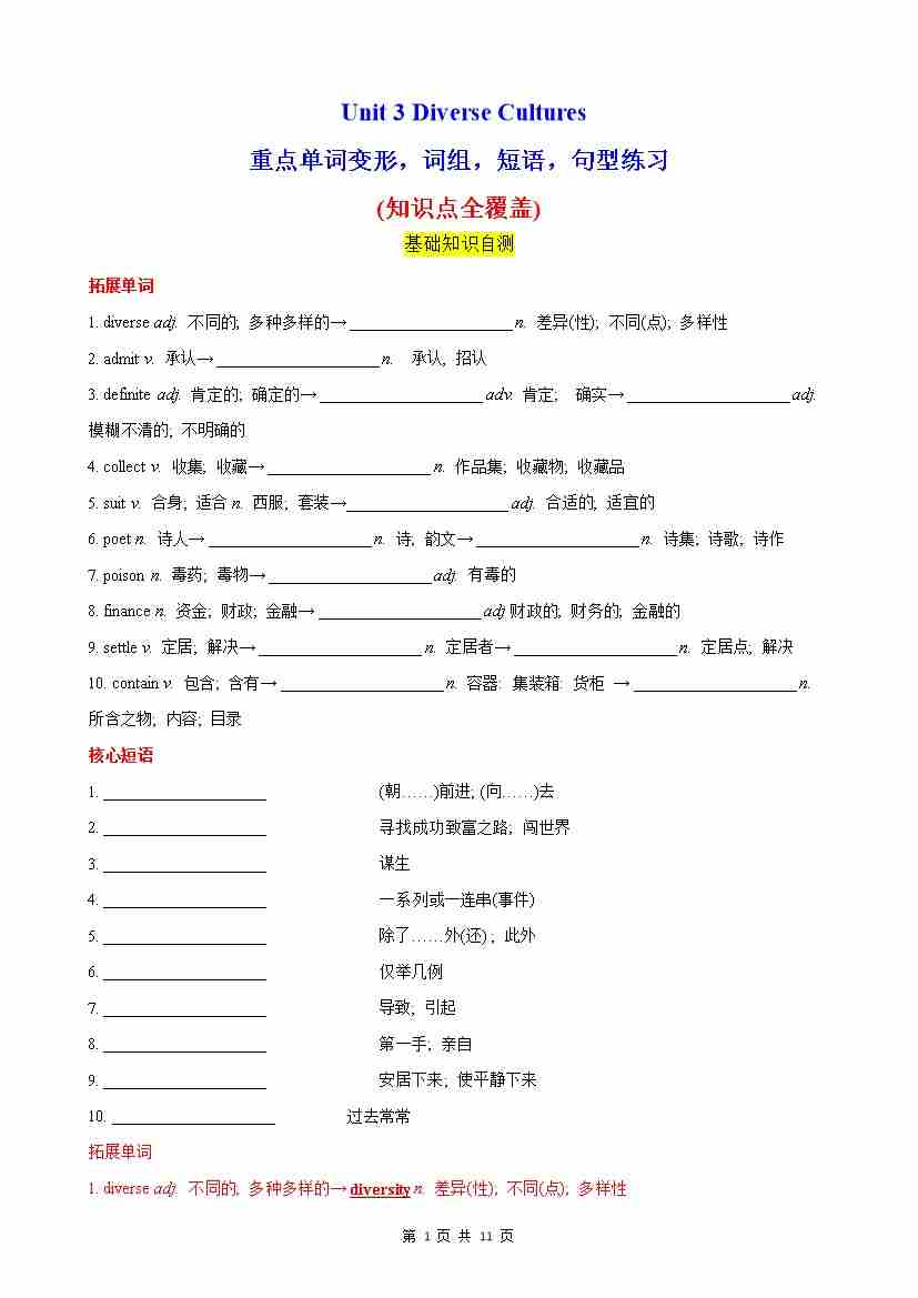 Unit 3 Diverse Cultures 重点单词,短语,句型,语法专项训练(分层作业)(原卷版)