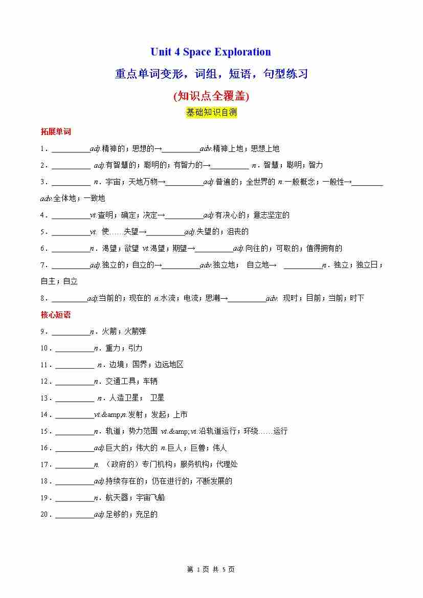 Unit 4 Space Exploration 单词,短语,句型,语法练习(分层作业)(原卷版)