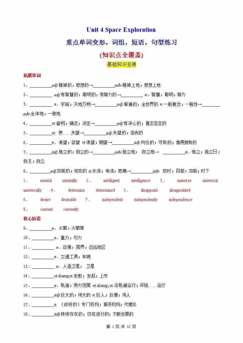 Unit 4 Space Exploration 单词,短语,句型,语法练习(分层作业)(解析版)