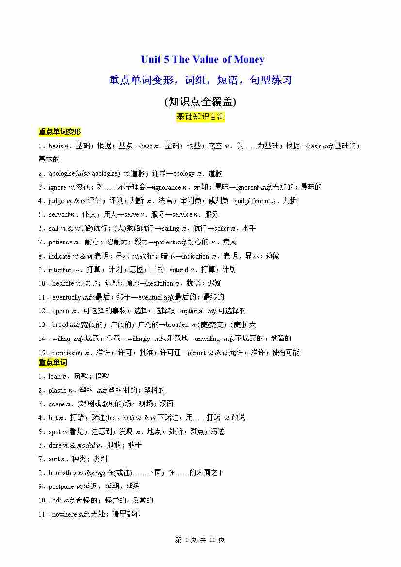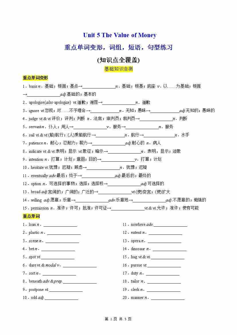 Unit 5 The Value of Money 重点单词,短语,句型,语法专项训练(分层作业)(原卷版)
