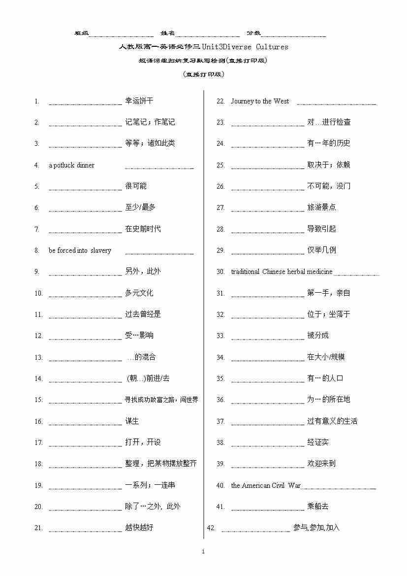 新人教版高一英语必修三Unit3 Diverse Cultures 短语词组归纳复习默写检测