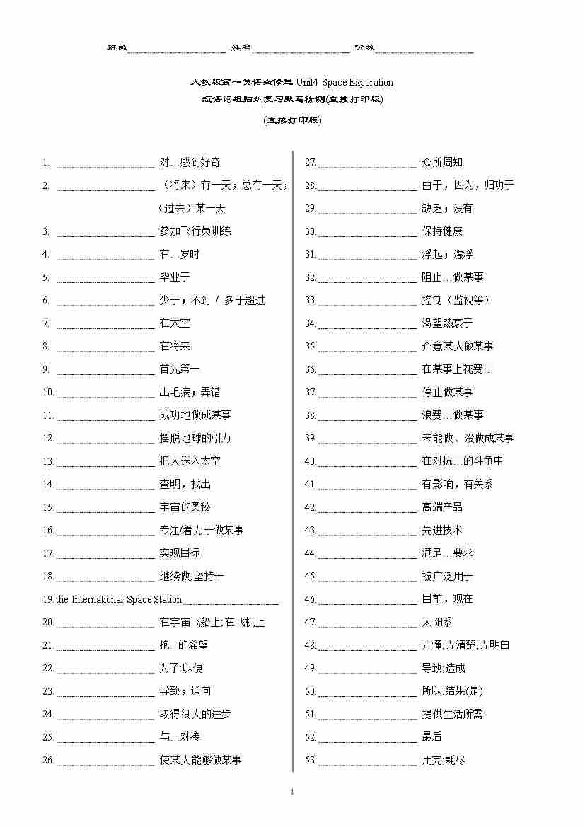 新人教版高一英语必修三Unit4 Space Exploration 短语词组归纳复习默写检测