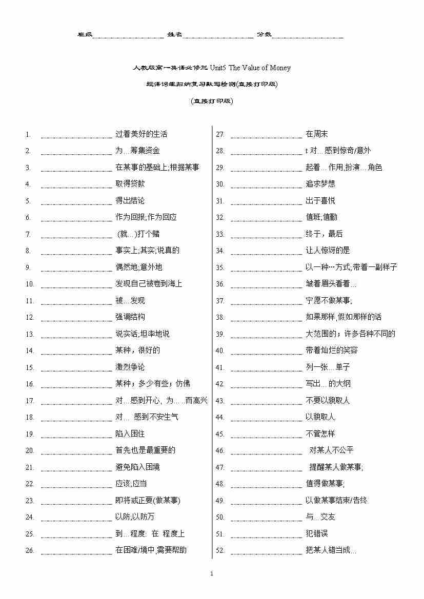 新人教版高一英语必修三Unit5 The Value of Money 短语词组归纳复习默写检测