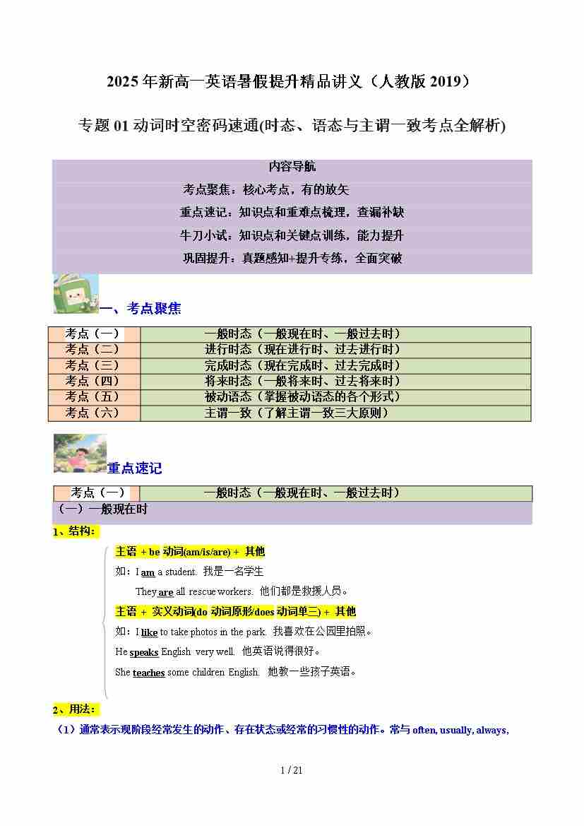 (专题01动词时空密码速通(时态、语态与主谓一致考点全解析)-【暑假自学课】2025年新高一英语暑假提升精品讲义(人教版2019)-原卷版
