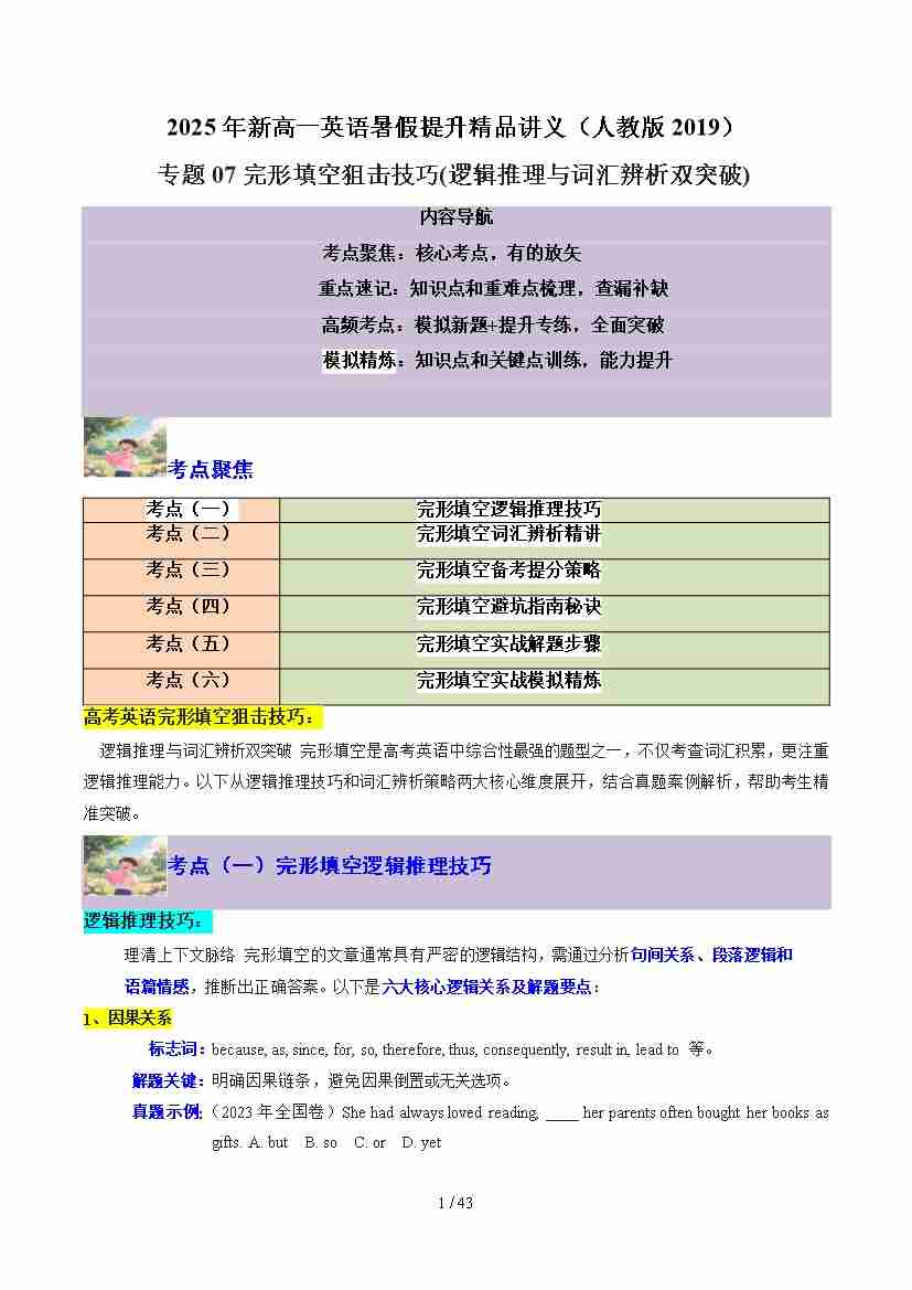 专题07完形填空狙击技巧(逻辑推理与词汇辨析双突破)-【暑假自学课】2025年新高一英语暑假提升精品讲义(人教版2019) -解析版