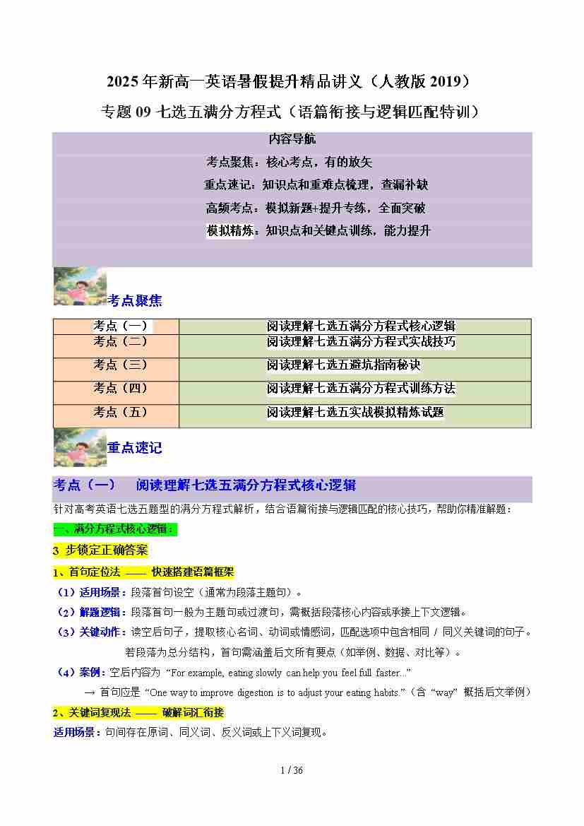 专题09七选五满分方程式(语篇衔接与逻辑匹配特训-【暑假自学课】2025年新高一英语暑假提升精品讲义(人教版2019)-解析版
