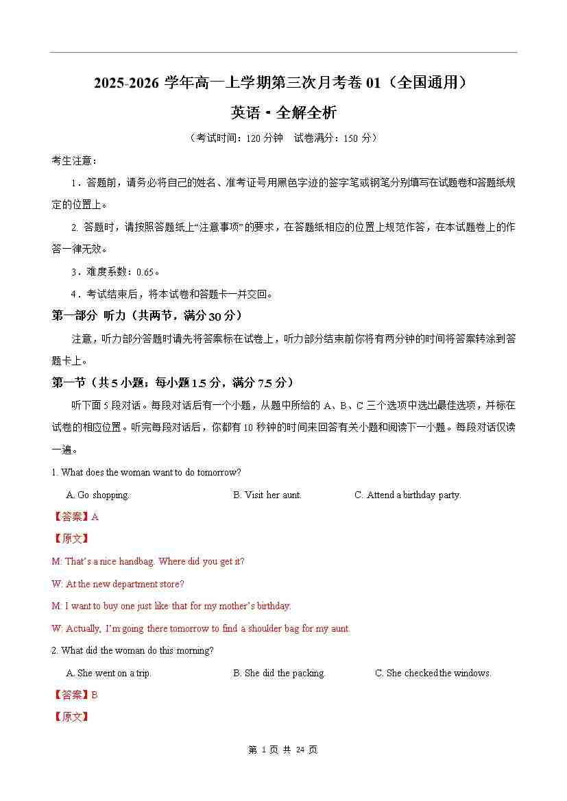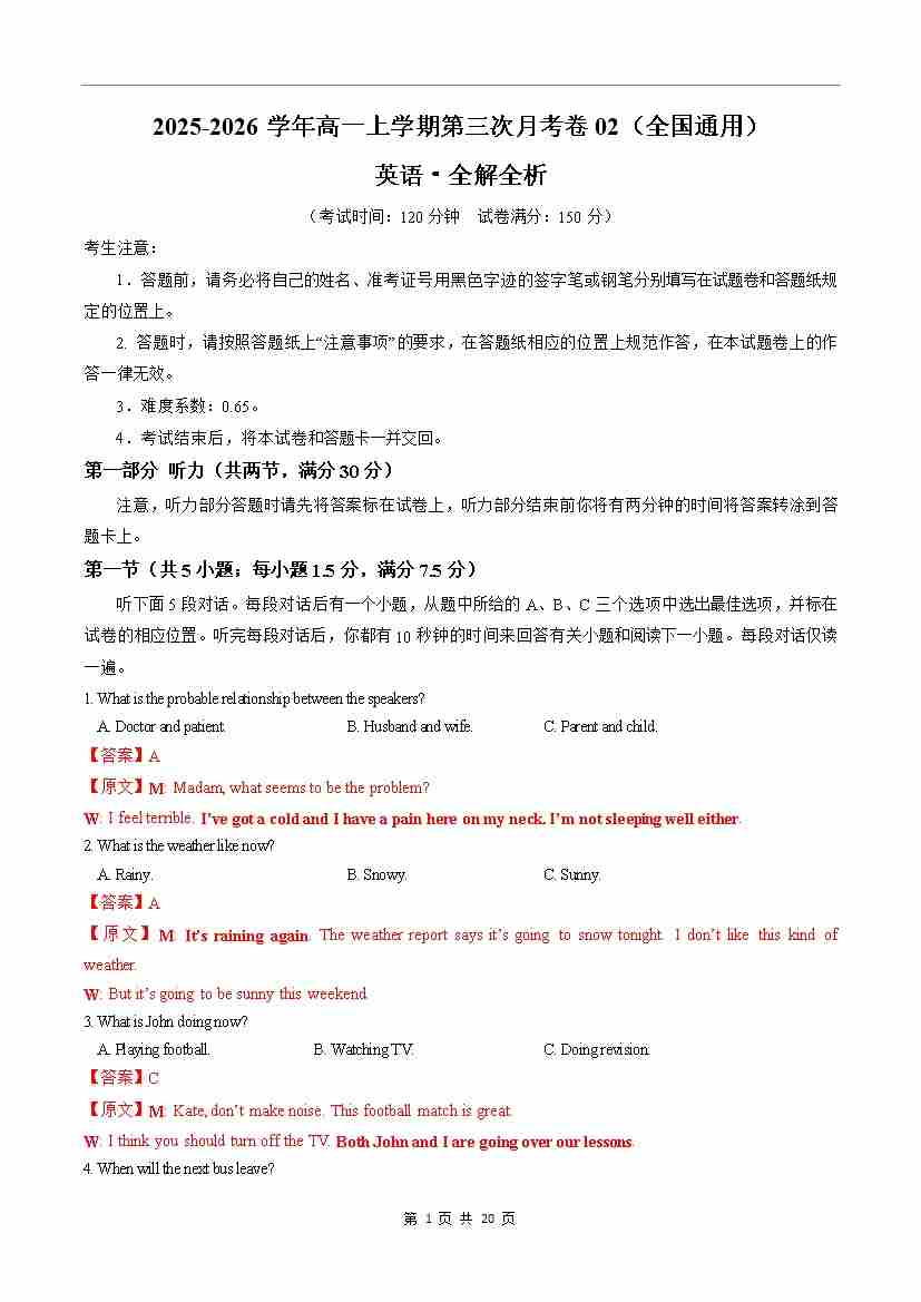 高一英语第三次月考卷01(全解全析)(全国通用)