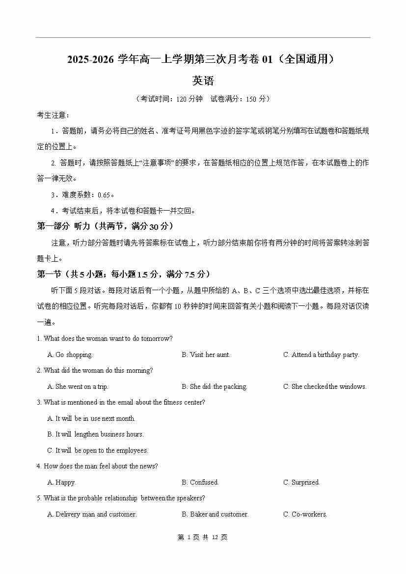 高一英语第三次月考卷01(考试版A4)(全国通用)
