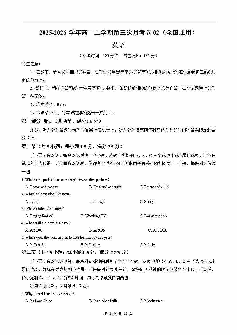 高一英语第三次月考卷02(考试版A4)(全国通用版)