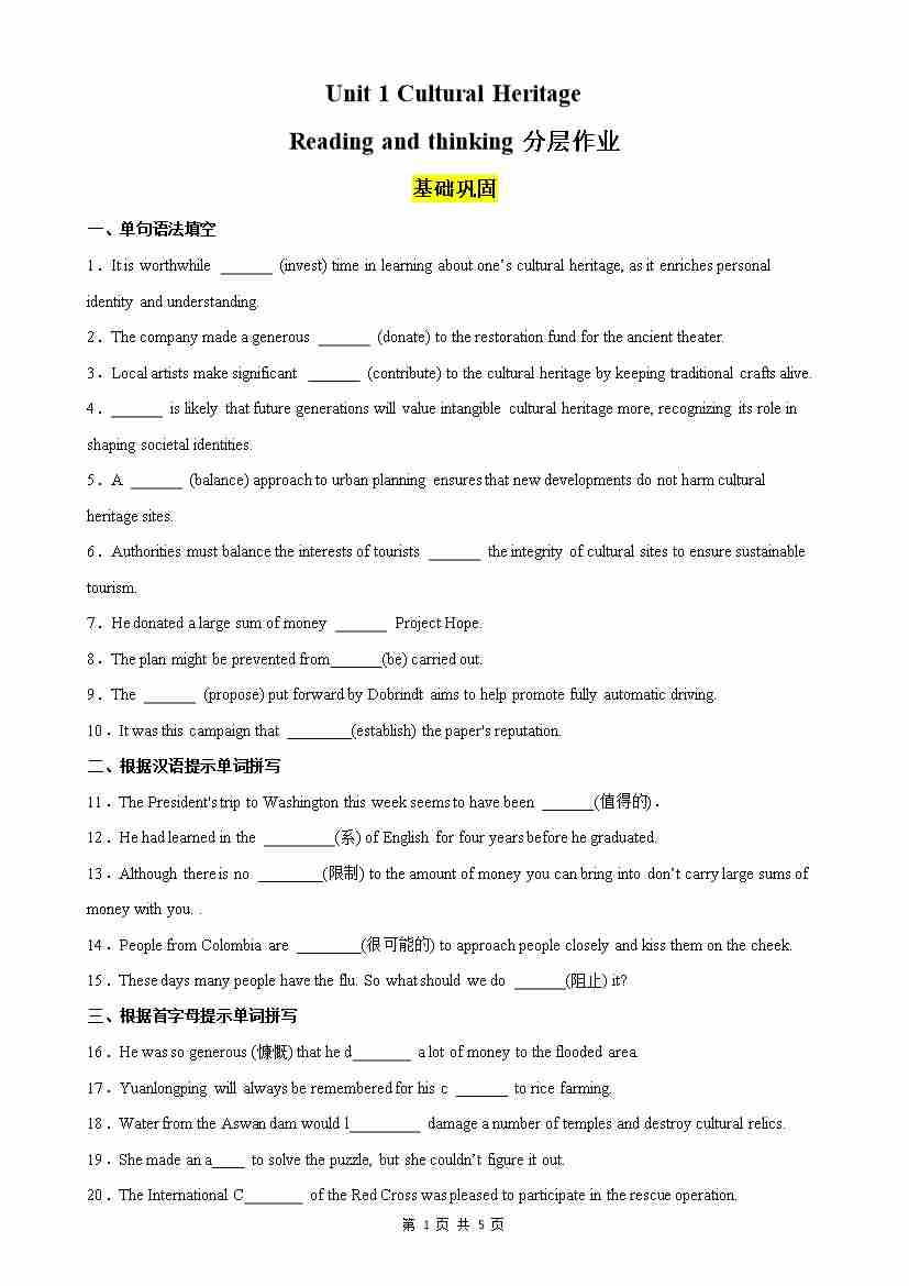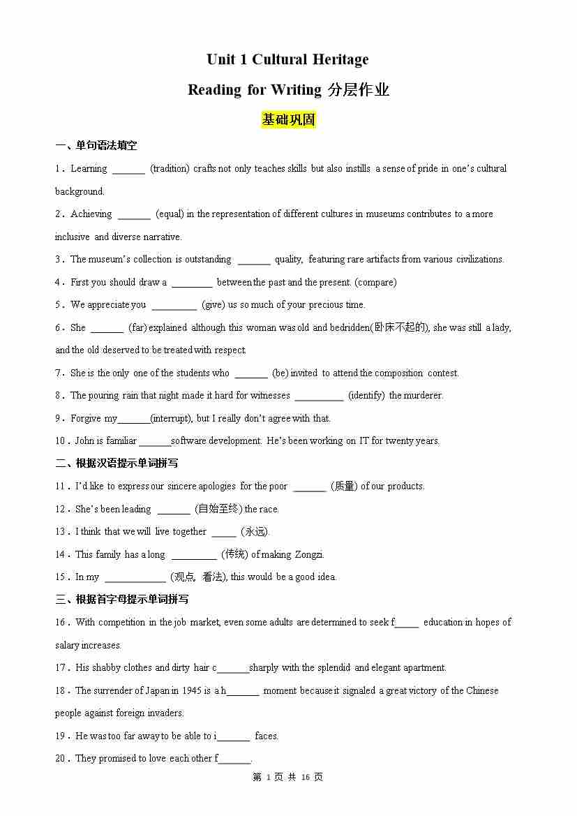 Unit 1 Cultural Heritage Reading for Writing分层作业(原卷版)
