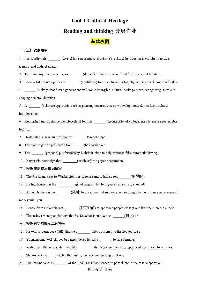 Unit 1 Cultural Heritage Reading and thinking分层作业(解析版)
