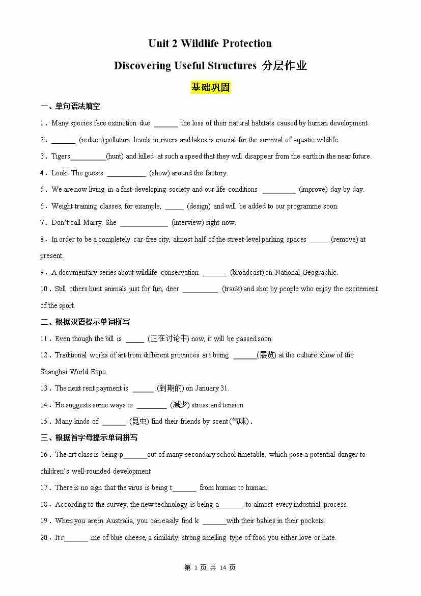 Unit 2 Wildlife Protection Discovering Useful Structures分层作业(原卷版)