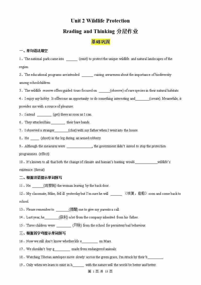 Unit 2 Wildlife Protection Reading and thinking分层作业(原卷版)