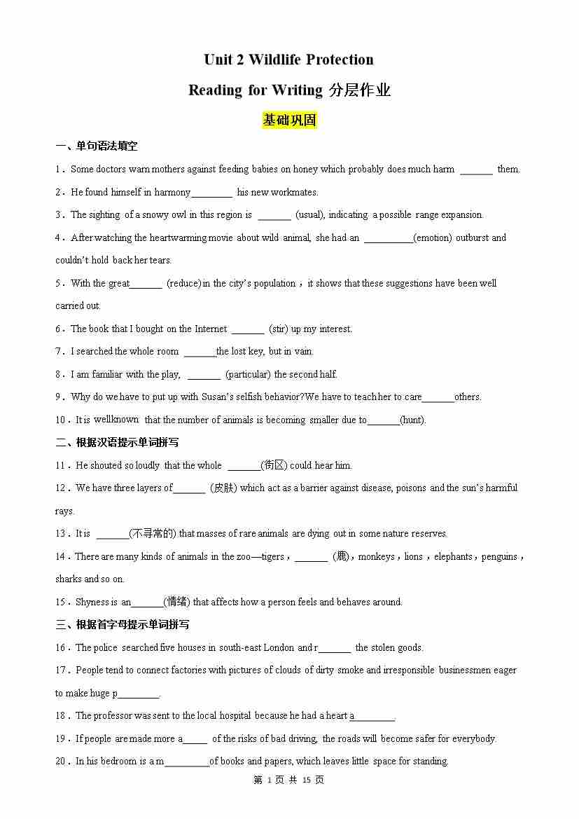 Unit 2 Wildlife Protection Reading for Writing分层作业(原卷版)