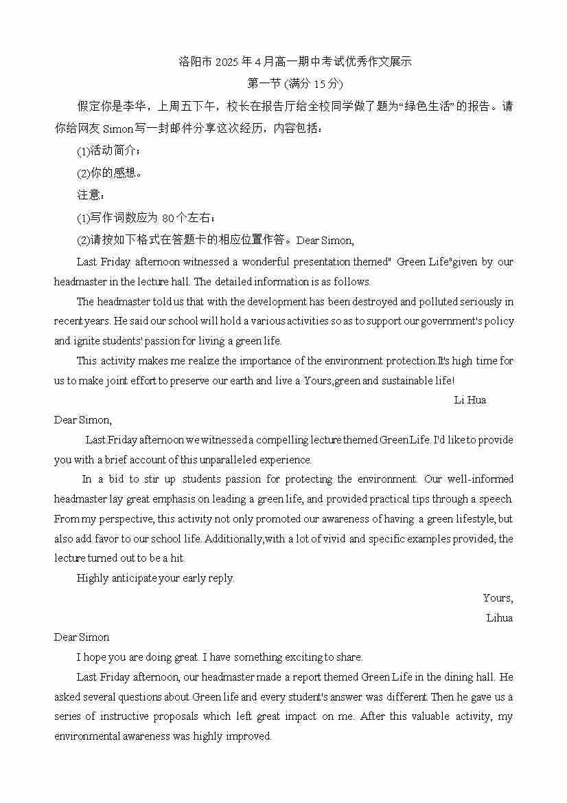 河南省洛阳市2024-2025学年高一下学期期中考试英语应用文写作优秀作文展示