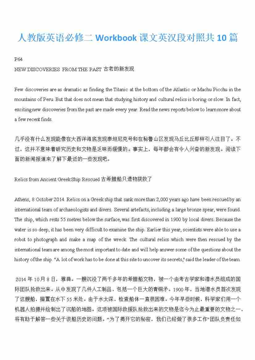 【12.9更新】人教版英语必修二Workbook课文英汉段对照共10篇