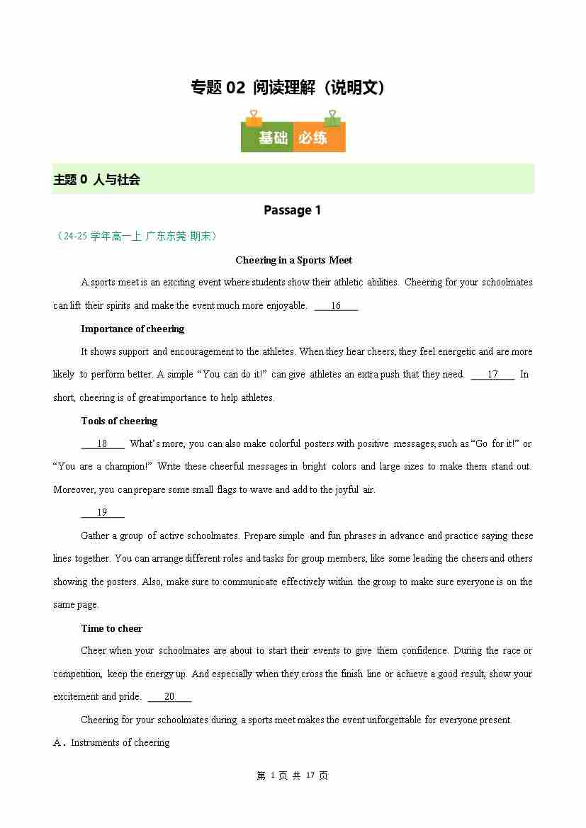 专题05 完形填空(记叙文、说明文)(期末真题汇编,全国通用)(解析版)