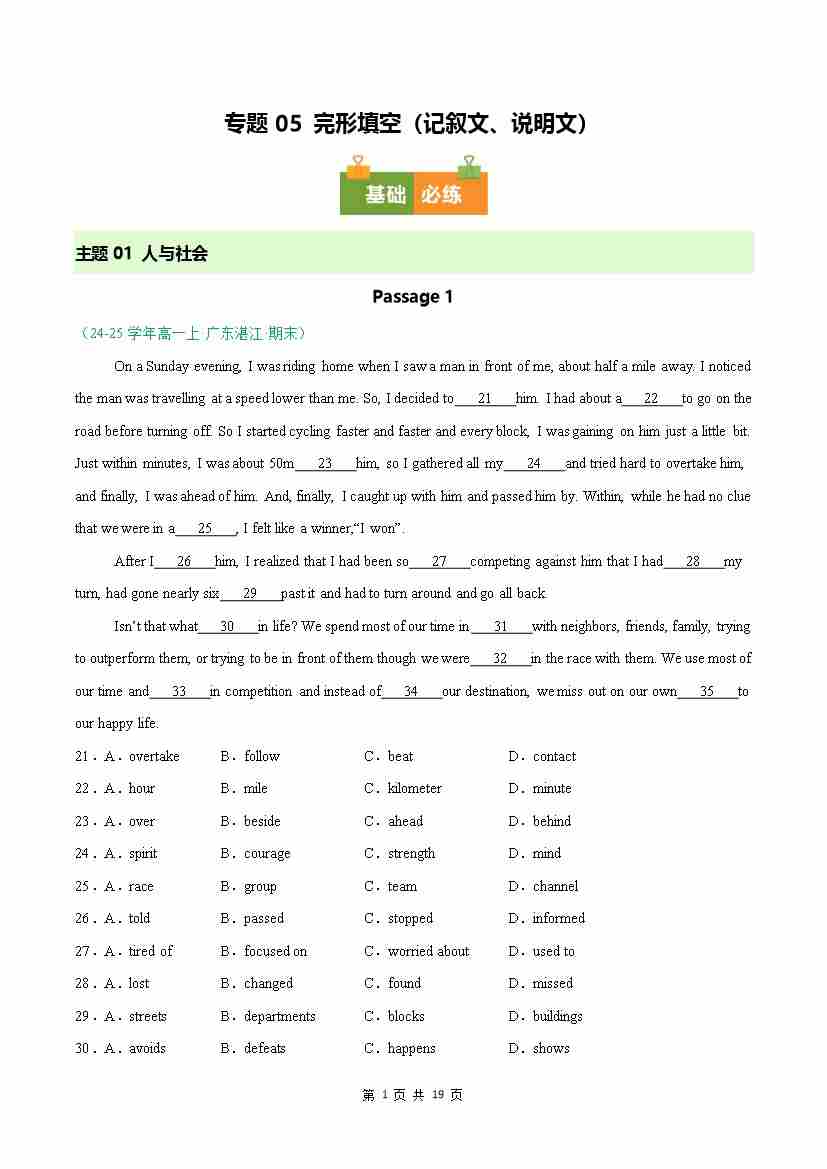 专题05 完形填空(记叙文、说明文)(期末真题汇编,全国通用)(原卷版)