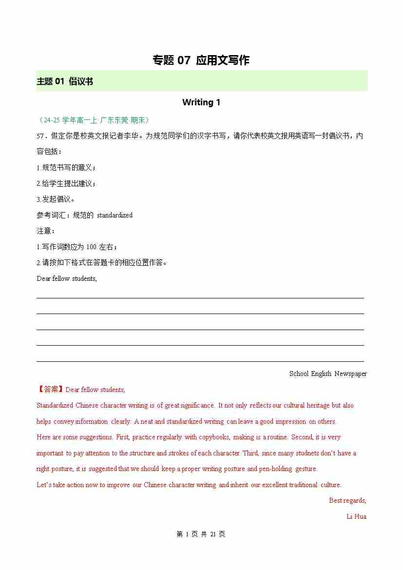 专题07 应用文写作(期末真题汇编,全国通用)(解析版)