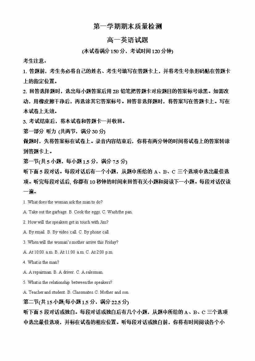 高一期末备考精编金卷 英语(AB 卷)含听力