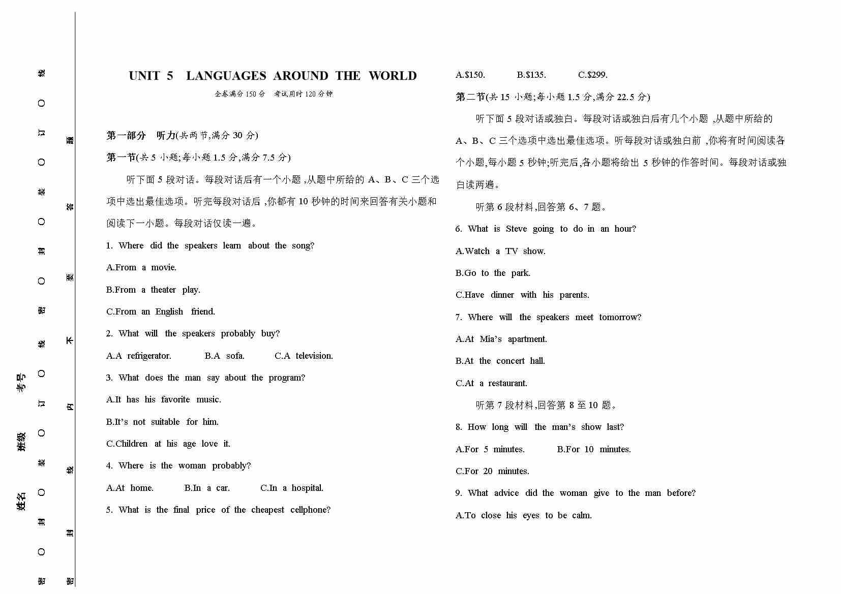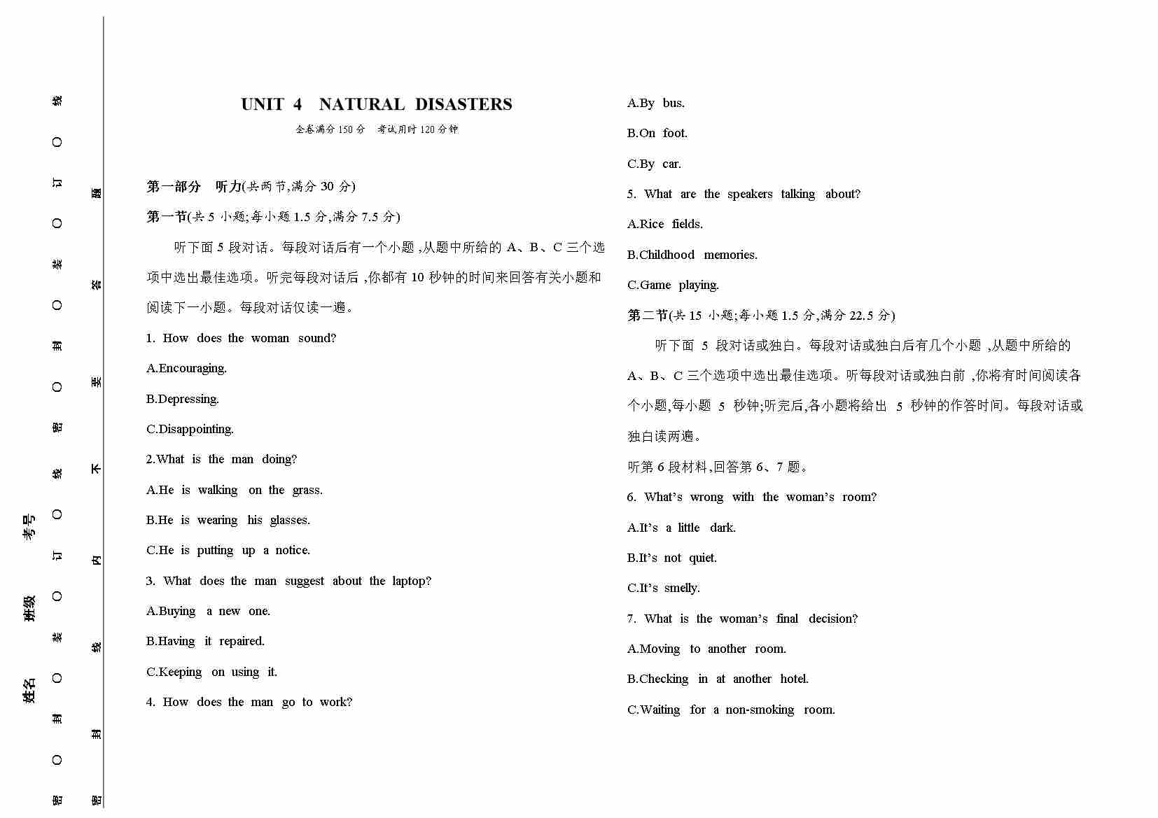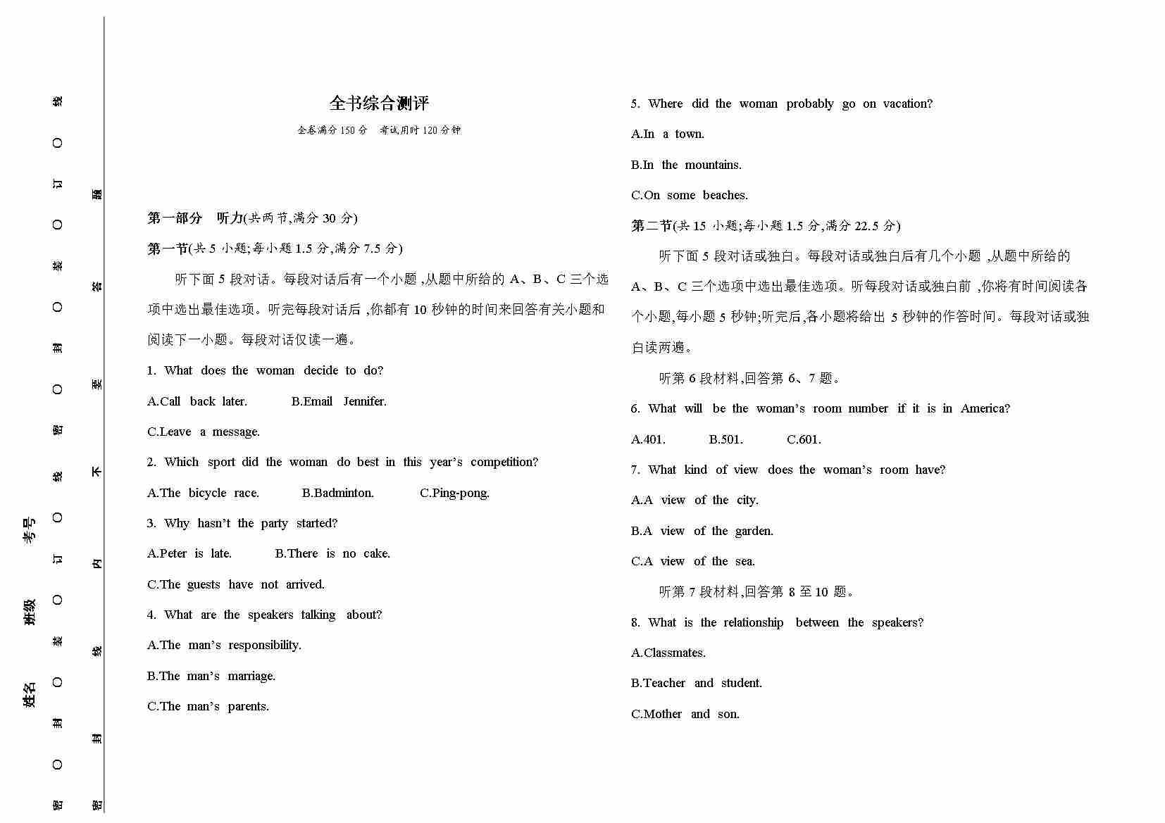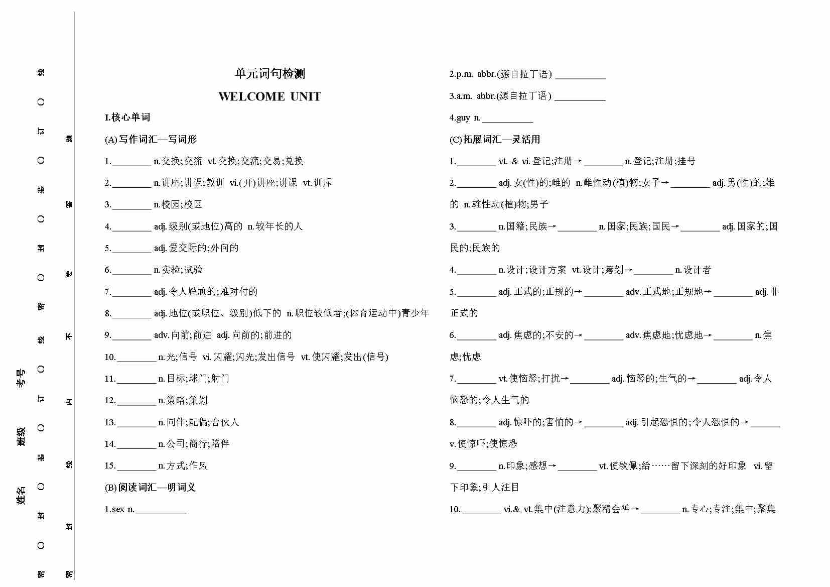 .一本-预备新高一-英语开学分班考