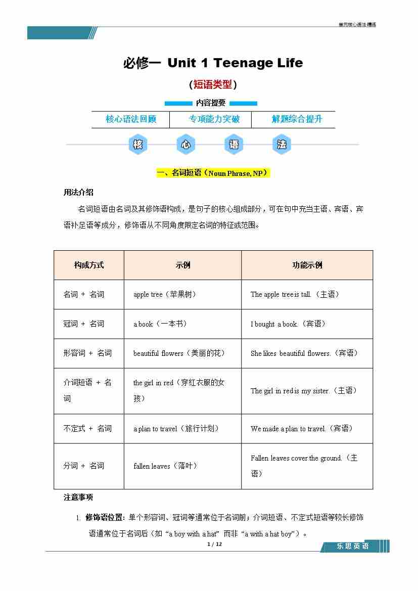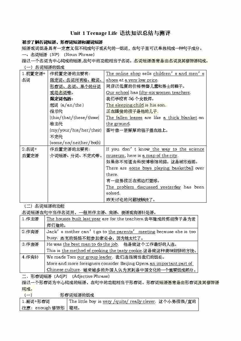 必修一 Unit 1 Teenage Life 短语类型(解析版)