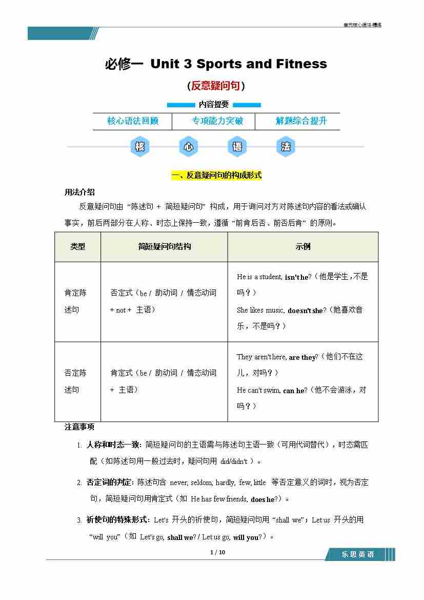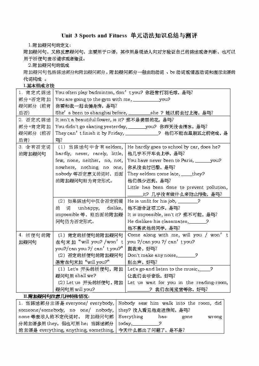 必修一 Unit 3 Sports and Fitness 反意疑问句(原卷版)