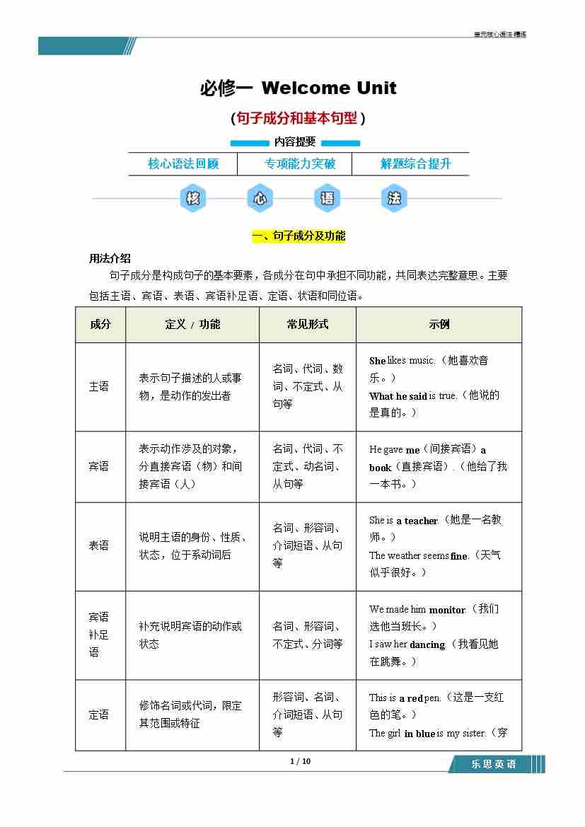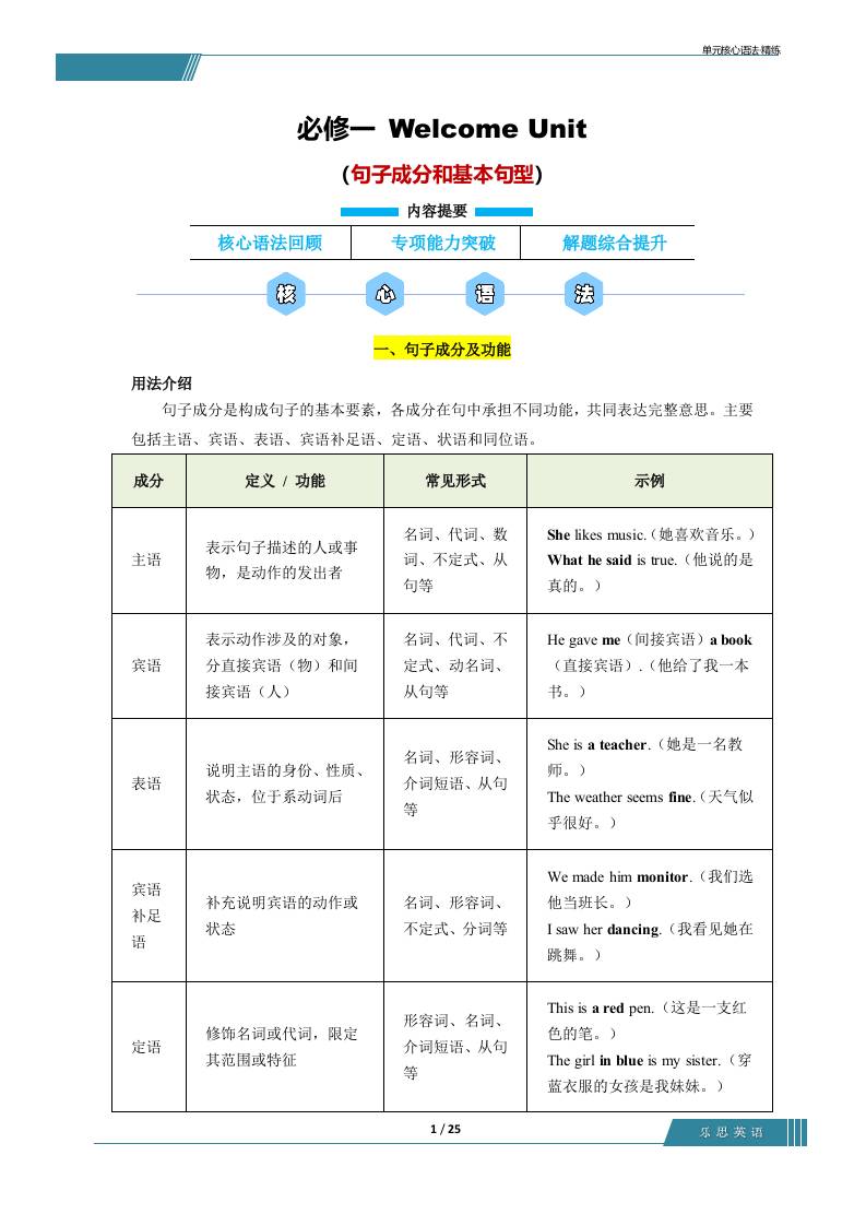 必修一 Welcome Unit 句子成分&基本句型(原卷版)