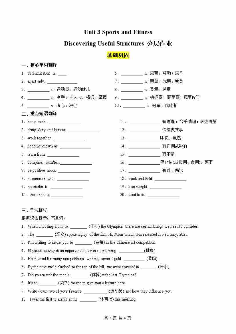 Unit 3 Sports and Fitness Discovering Useful Structures分层作业(原卷版)