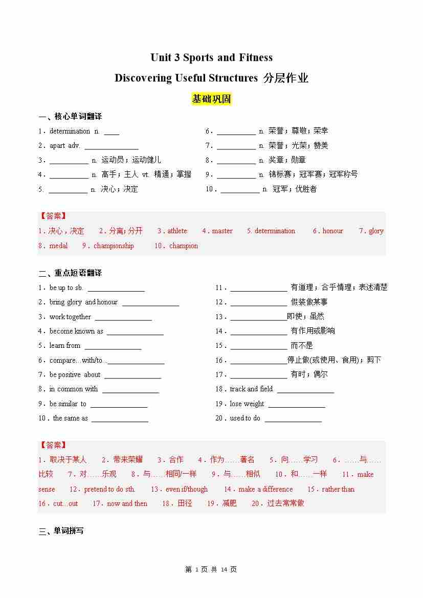 Unit 3 Sports and Fitness Discovering Useful Structures分层作业(解析版)