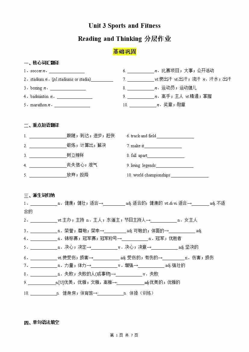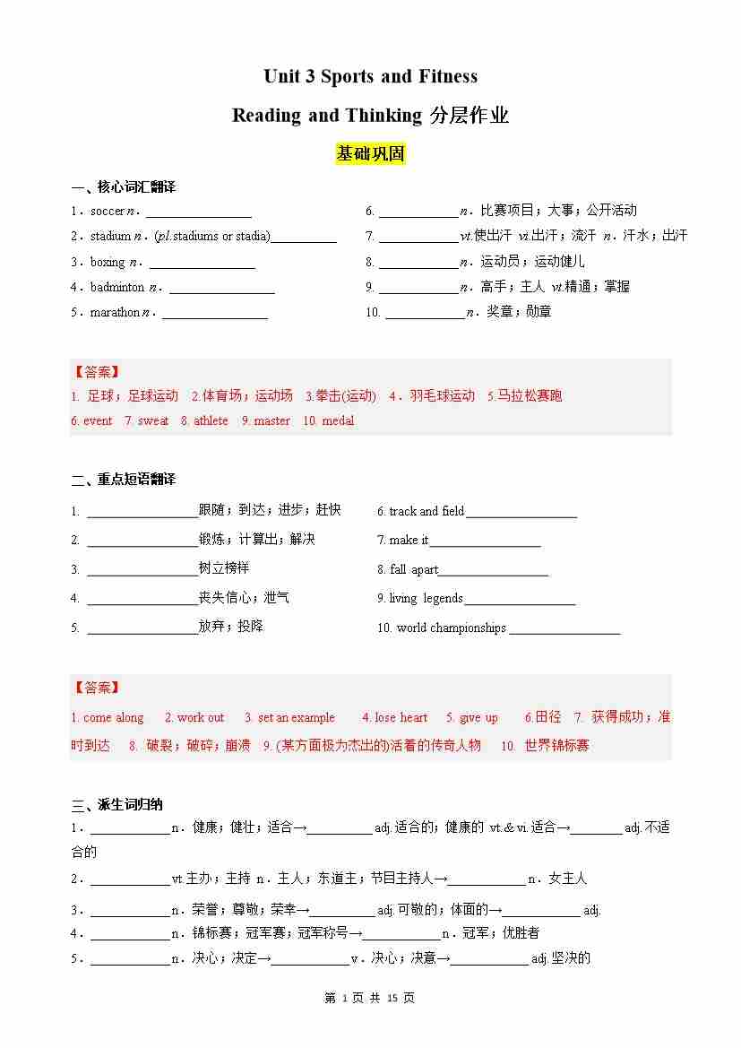 Unit 3 Sports and Fitness Reading and Thinking分层作业(解析版)
