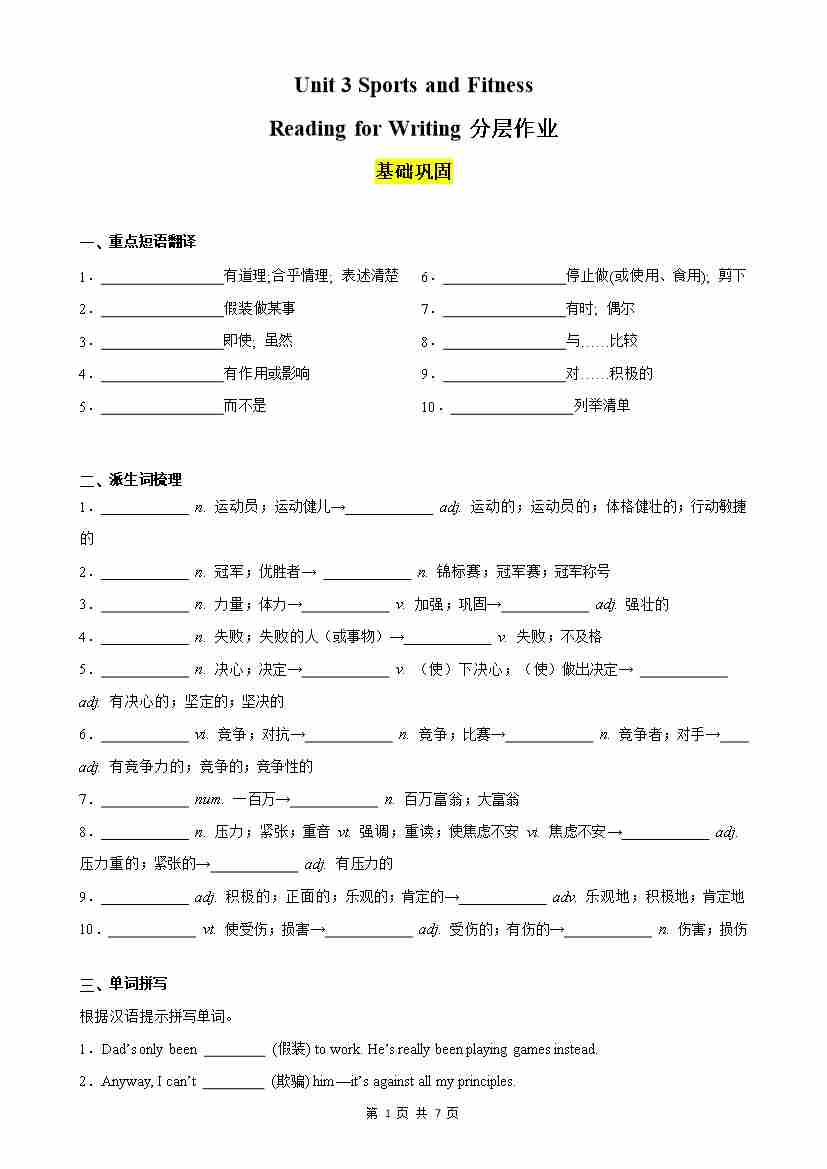 Unit 3 Sports and Fitness Reading for Writing分层作业(原卷版)