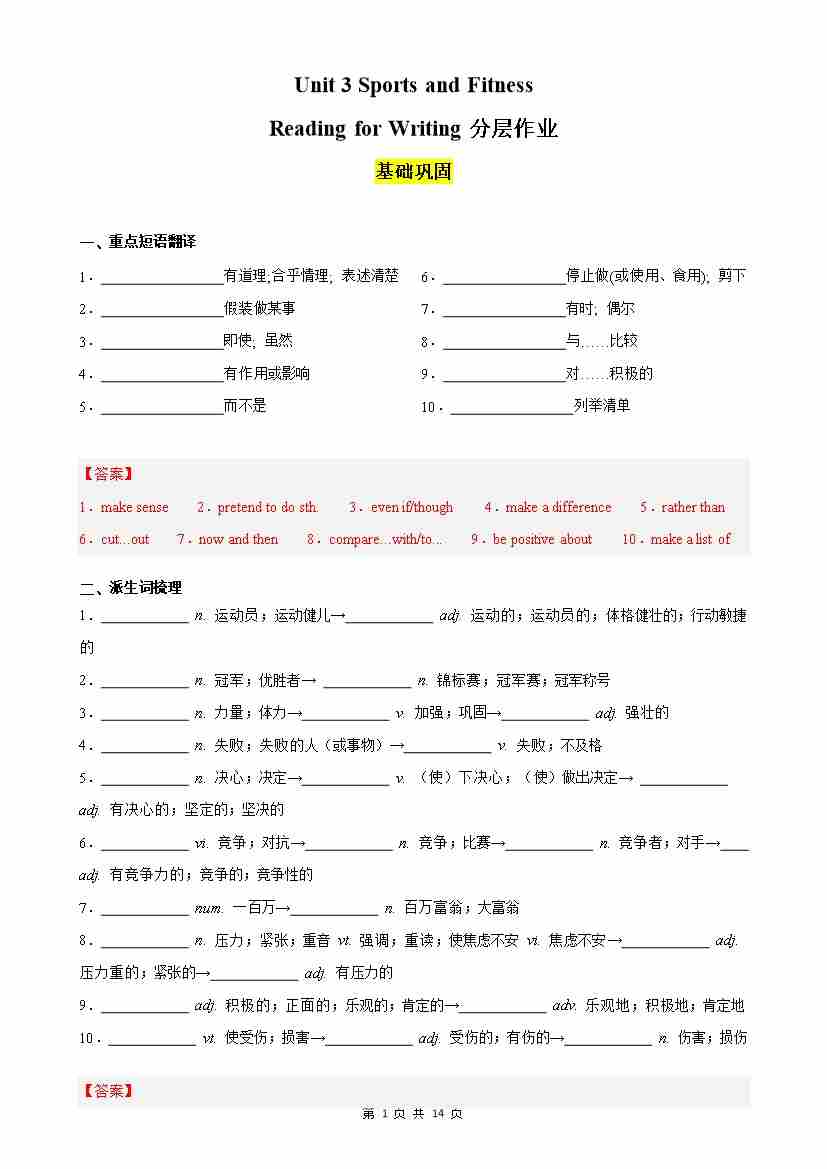 Unit 3 Sports and Fitness Reading for Writing分层作业(解析版)
