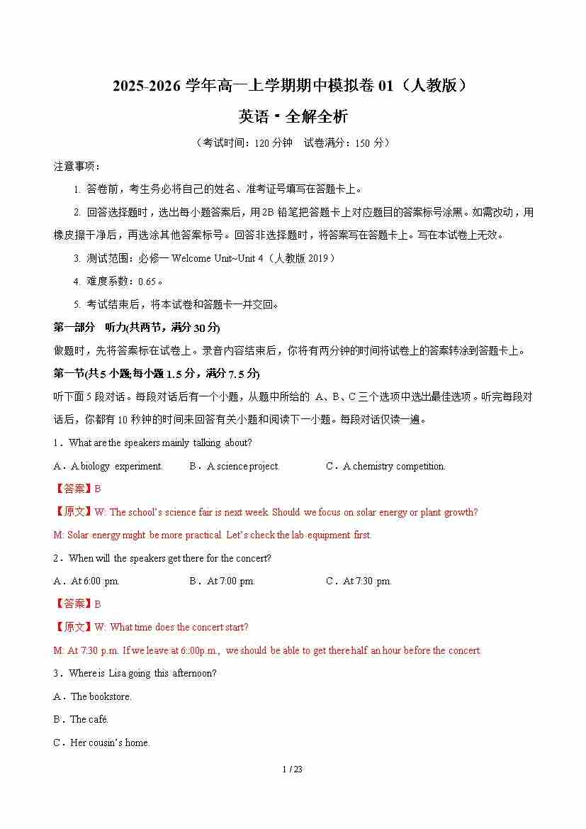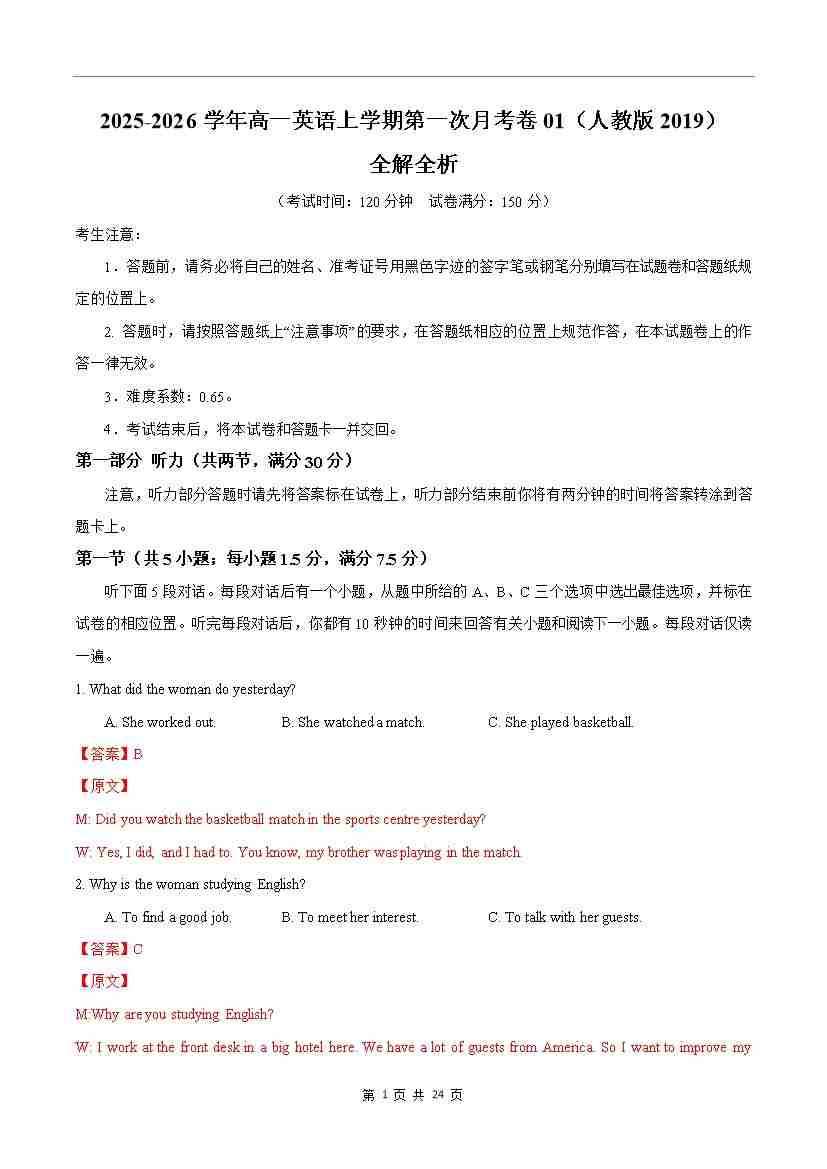 高一英语第一次月考卷01(全解全析)(人教版2019)
