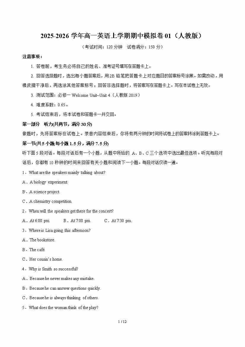 高一英语第一次月考卷01(考试版A4)(人教版2019)