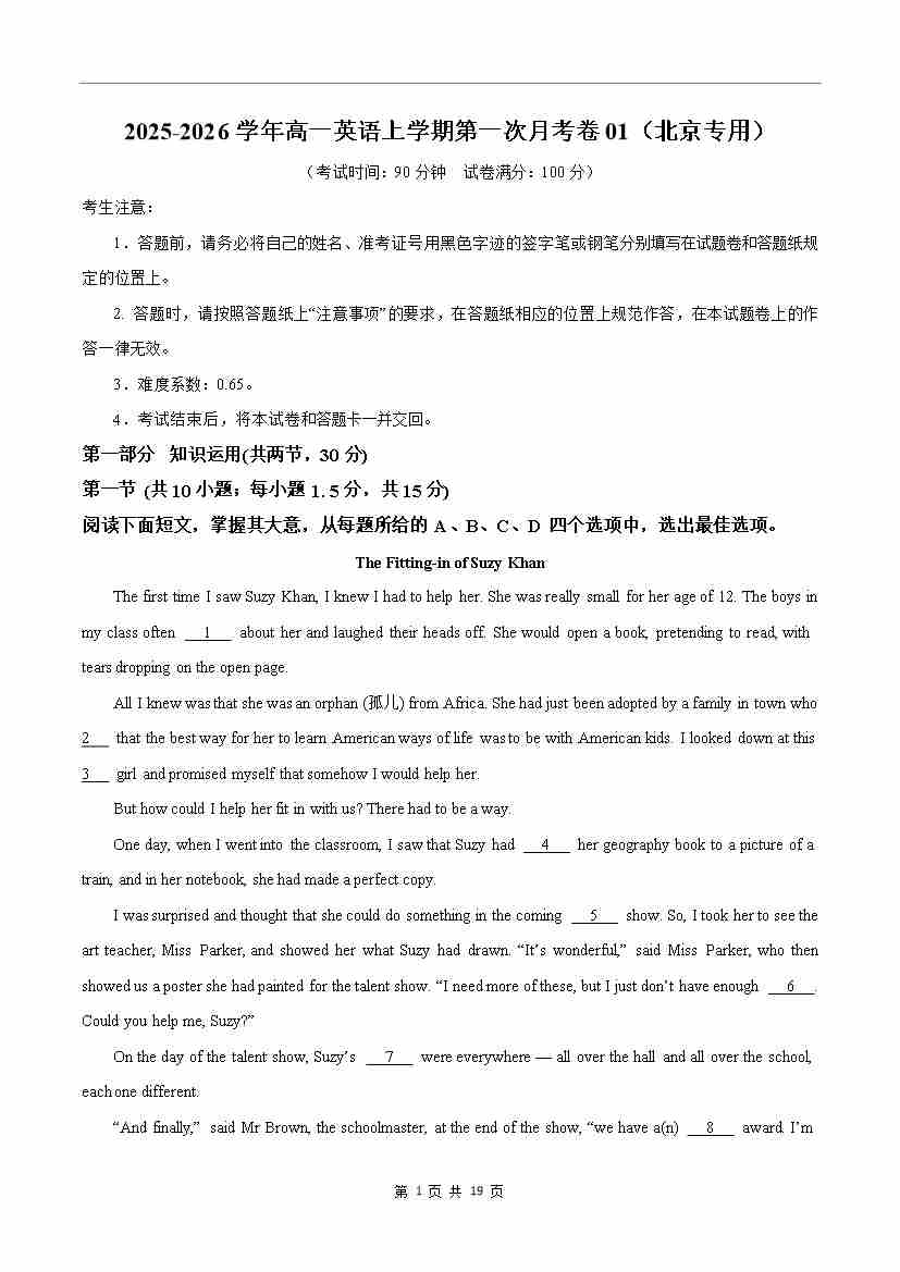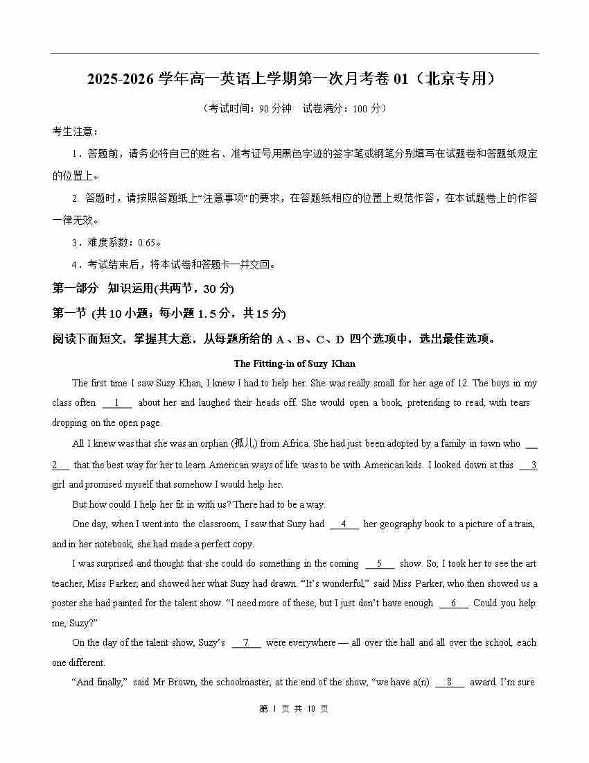 高一英语第一次月考01(考试版)(北京专用)