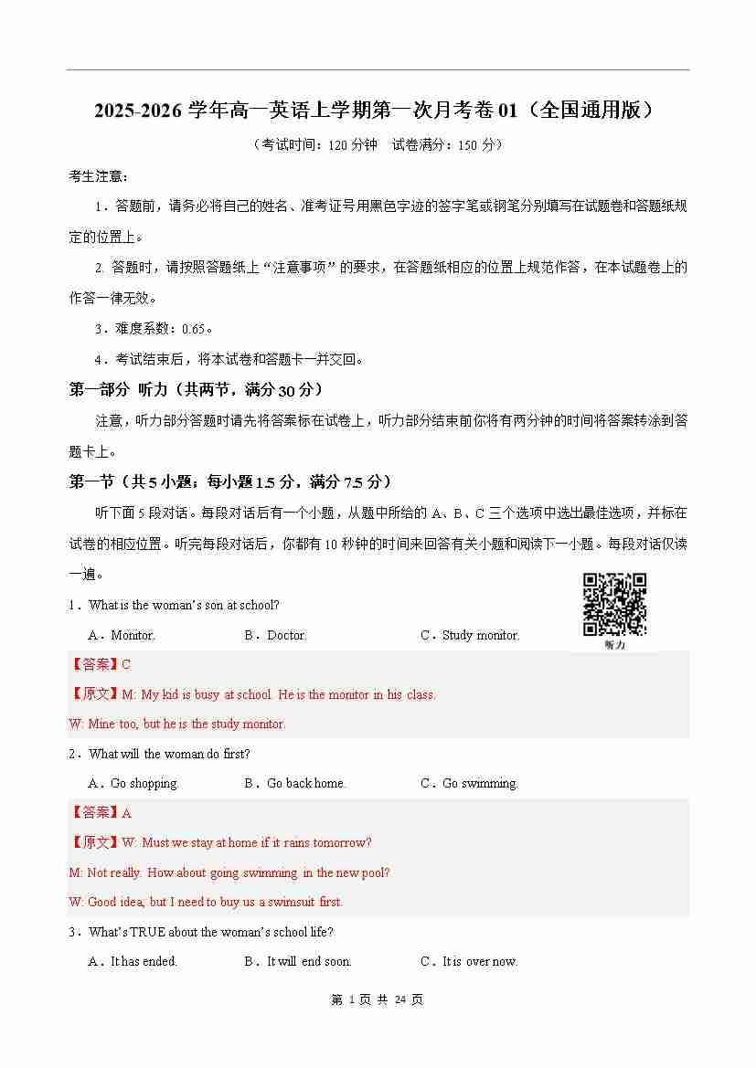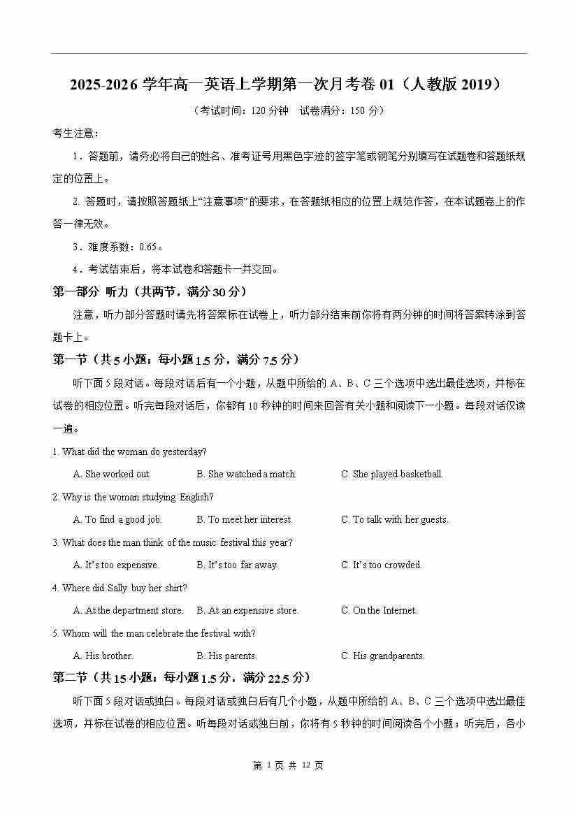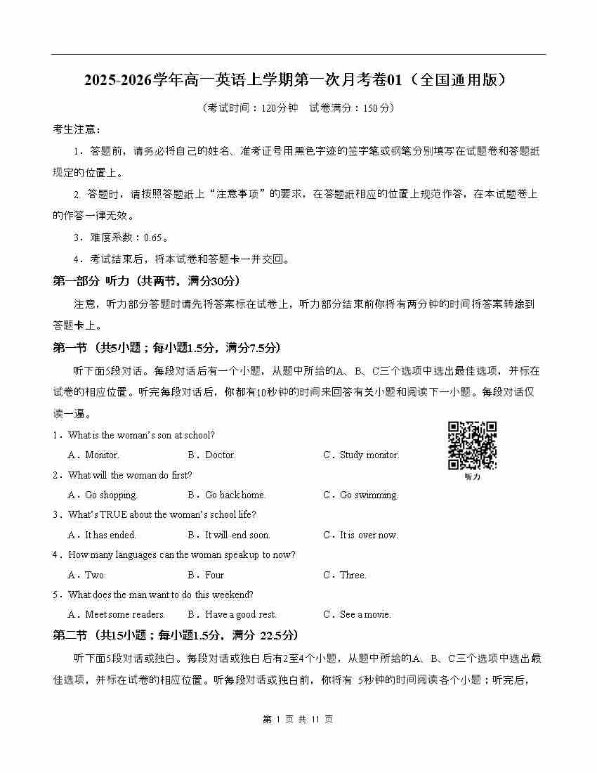 高一英语第一次月考卷01(考试版A4)(全国通用版))