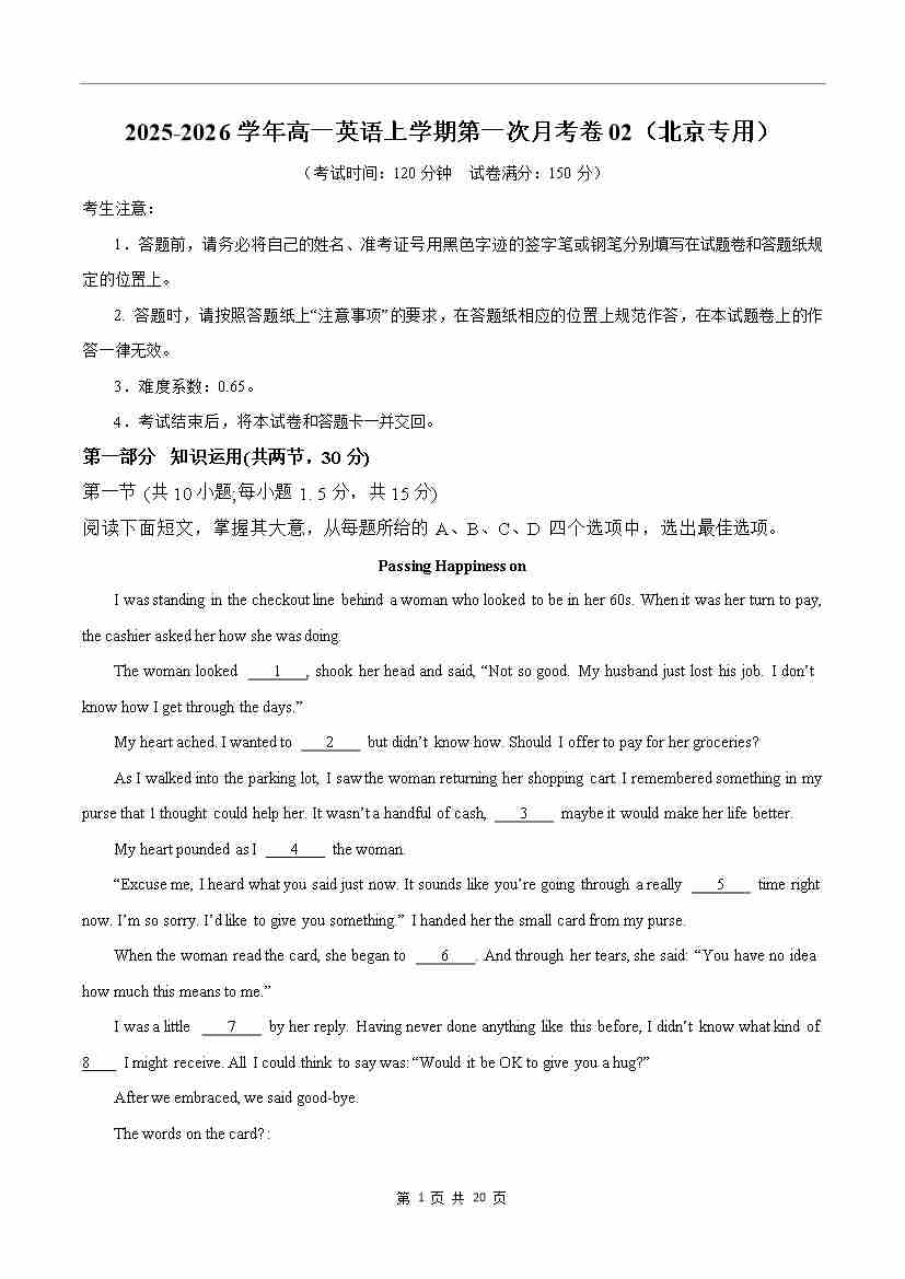 高一英语第一次月考卷02(考试版A4)(北京专用)