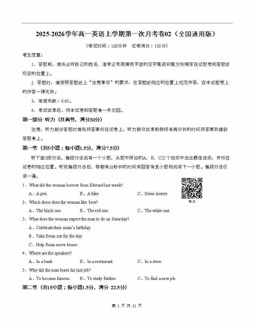 高一英语第一次月考卷02(考试版A4)(全国通用版))