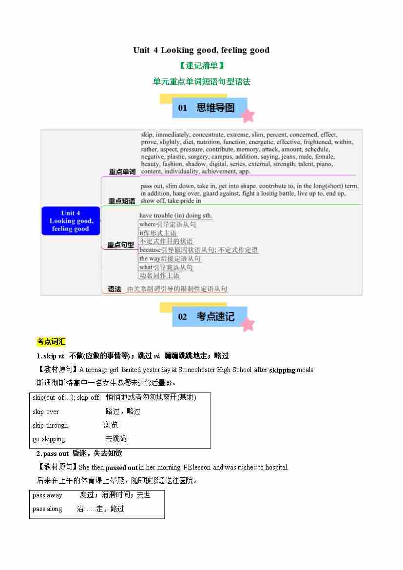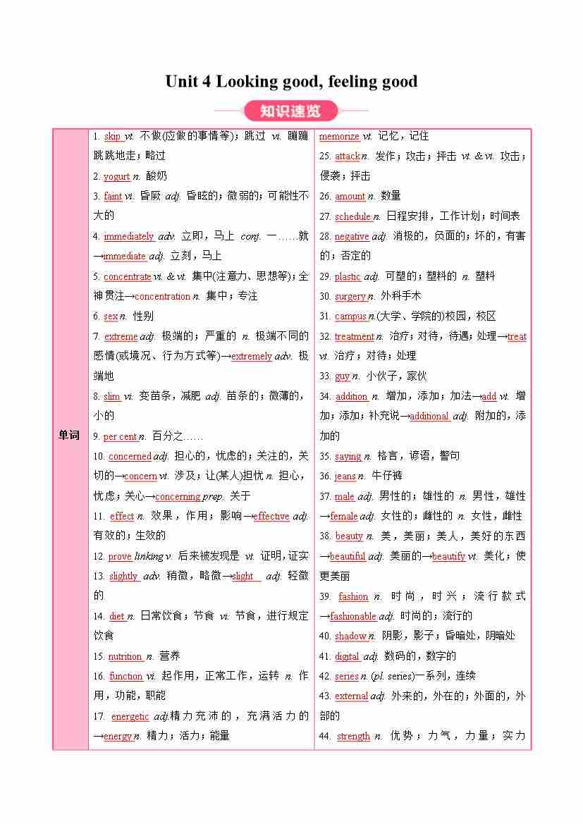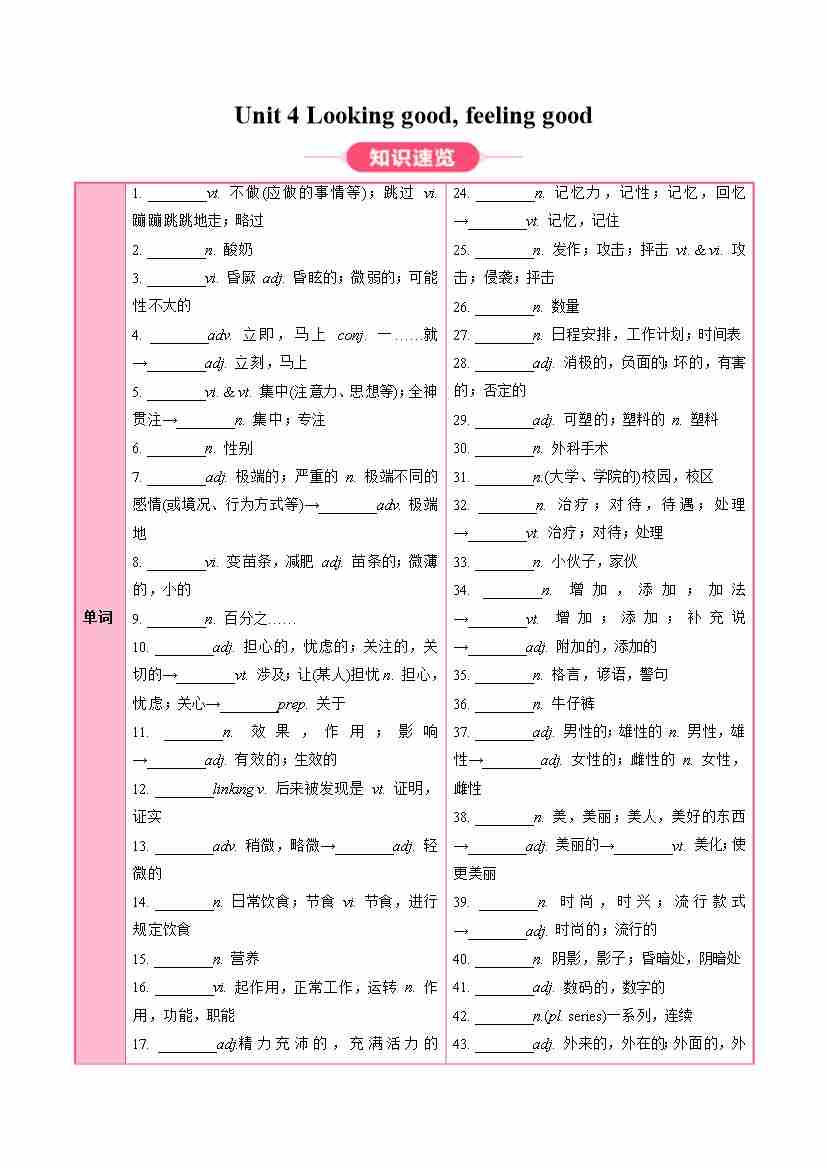 Unit 4 Looking good, feeling good(知识清单)-(译林版2020必修第一册)
