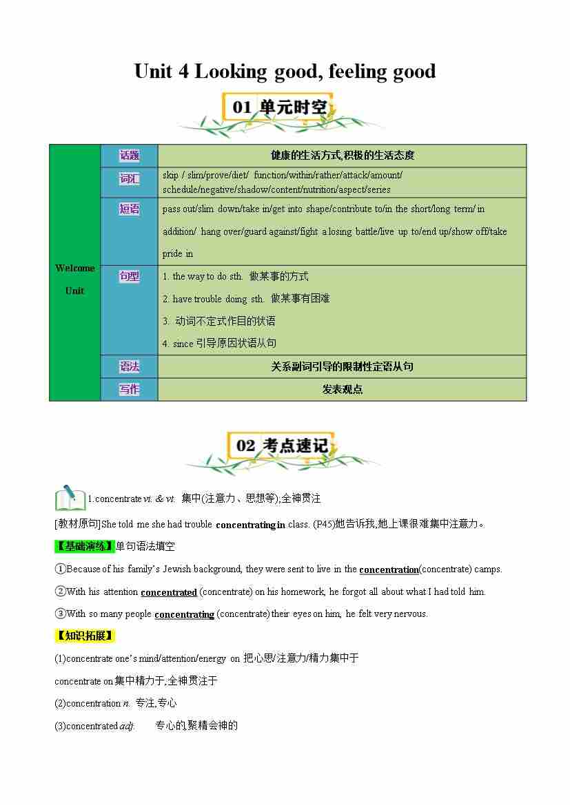 Unit 4 Looking good,feeling good(知识清单)(学生版)-(译林版2020必修第一册)
