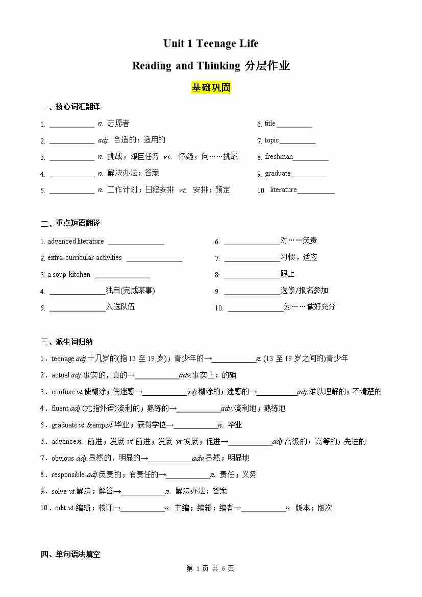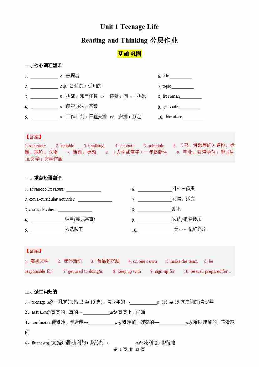 Unit 1 Teenage Life Reading and Thinking分层作业(原卷版)
