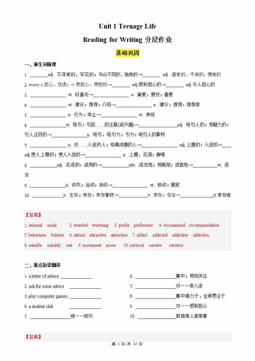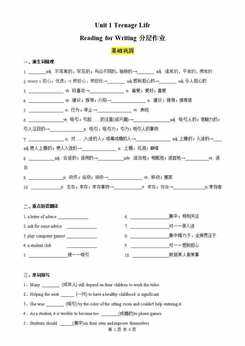 Unit 1 Teenage Life Reading for Writing分层作业(原卷版)