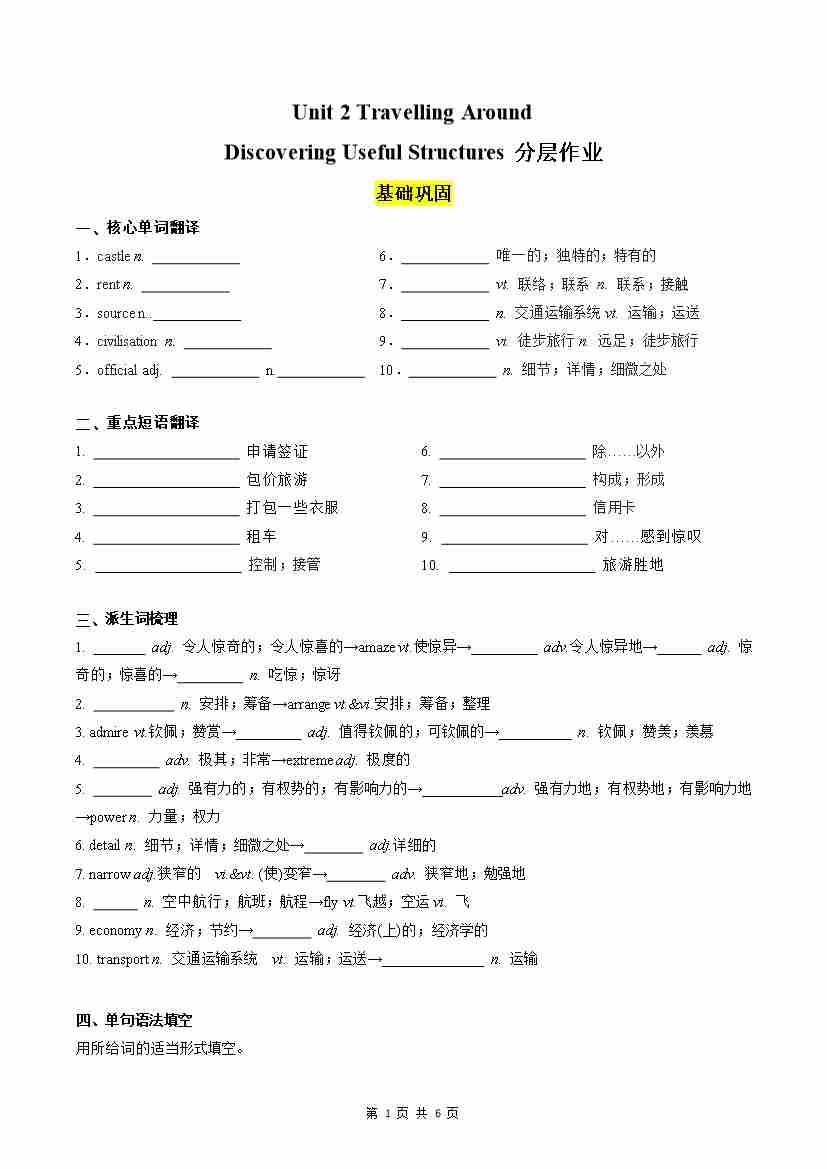 Unit 2 Travelling Around Discovering Useful Structures分层作业(原卷版)